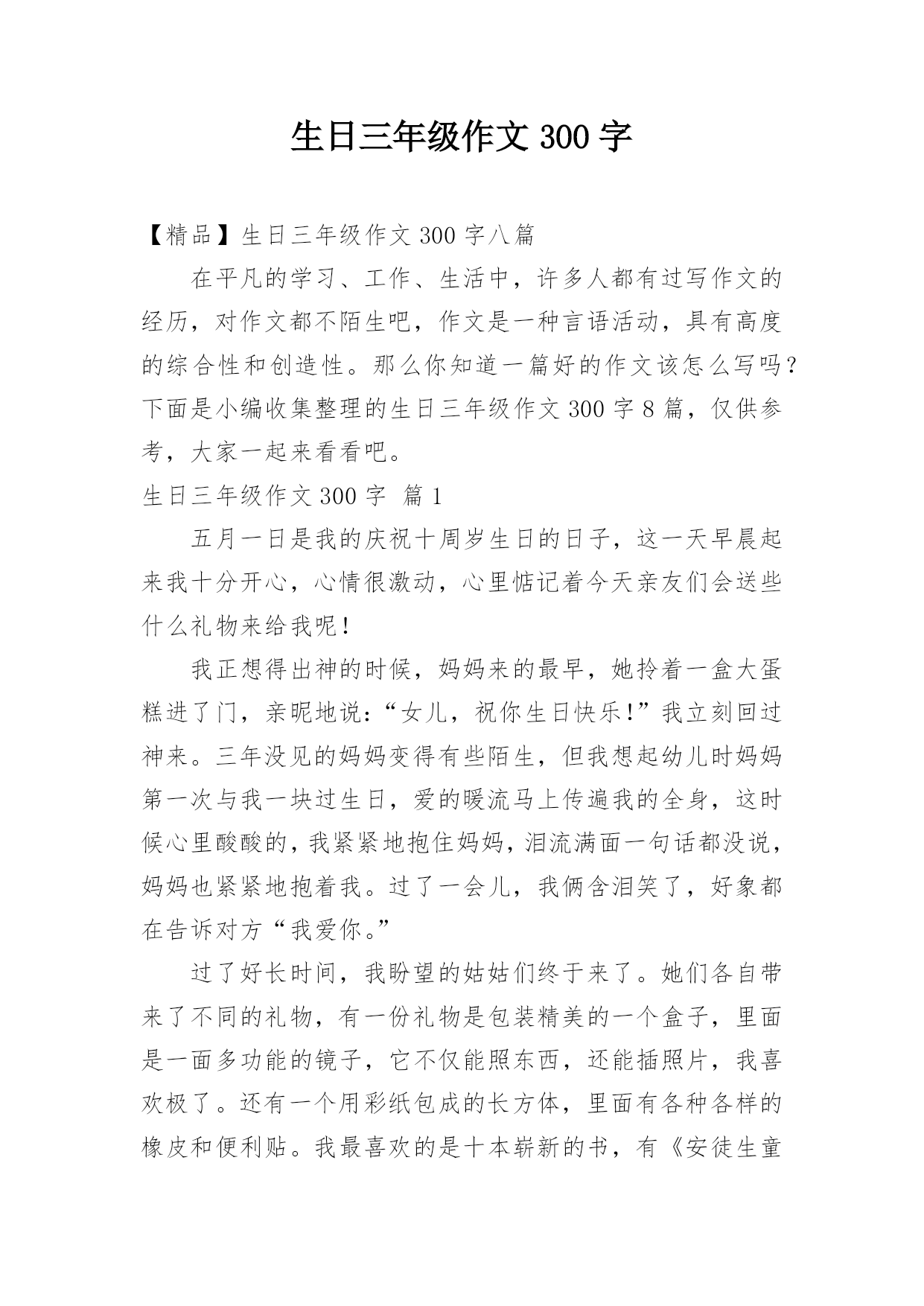生日三年级作文300字【精品】生日三年级作文300字八篇在平凡的学习、工作、生活中,许多人都有过写作文的经历,对作文都不陌生吧,作文是一种言语活动,具有高度的综合性和创造性。那么你知道一篇好的作文该怎么写吗?下面是小编收集整理的生日三年级作文300字8篇,仅供参考,大家一起来看看吧。生日三年级作文300字篇1五月一日是我的庆祝十周岁生日的日子,这一天早晨起来我十分开心,心情很激动,心里惦记着今天亲友们会送些什么礼物来给我呢!我正想得出神的时候,妈妈来的最早,她拎着一盒大蛋糕进了门,亲昵地说:“女儿,祝你生