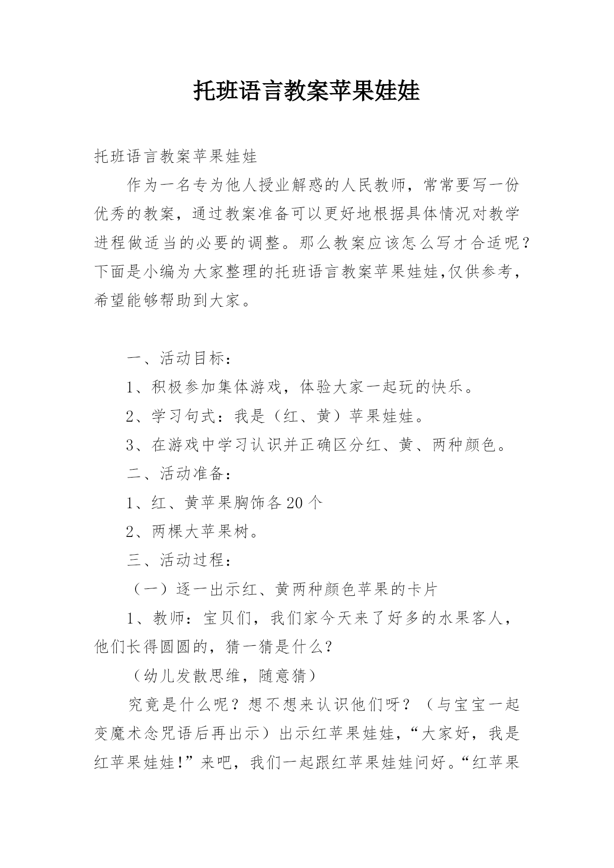 托班语言教案苹果娃娃托班语言教案苹果娃娃作为一名专为他人授业解惑的人民教师,常常要写一份优秀的教案,通过教案准备可以更好地根据具体情况对教学进程做适当的必要的调整。那么教案应该怎么写才合适呢?下面是小编为大家整理的托班语言教案苹果娃娃,仅供参考,希望能够帮助到大家。一、活动目标:1、积极参加集体游戏,体验大家一起玩的快乐。2、学习句式:我是(红、黄)苹果娃娃。3、在游戏中学习认识并正确区分红、黄、两种颜色。二、活动准备:1、红、黄苹果胸饰各20个2、两棵大苹果树。三、活动过程:(一)逐一出示红、黄两种颜色