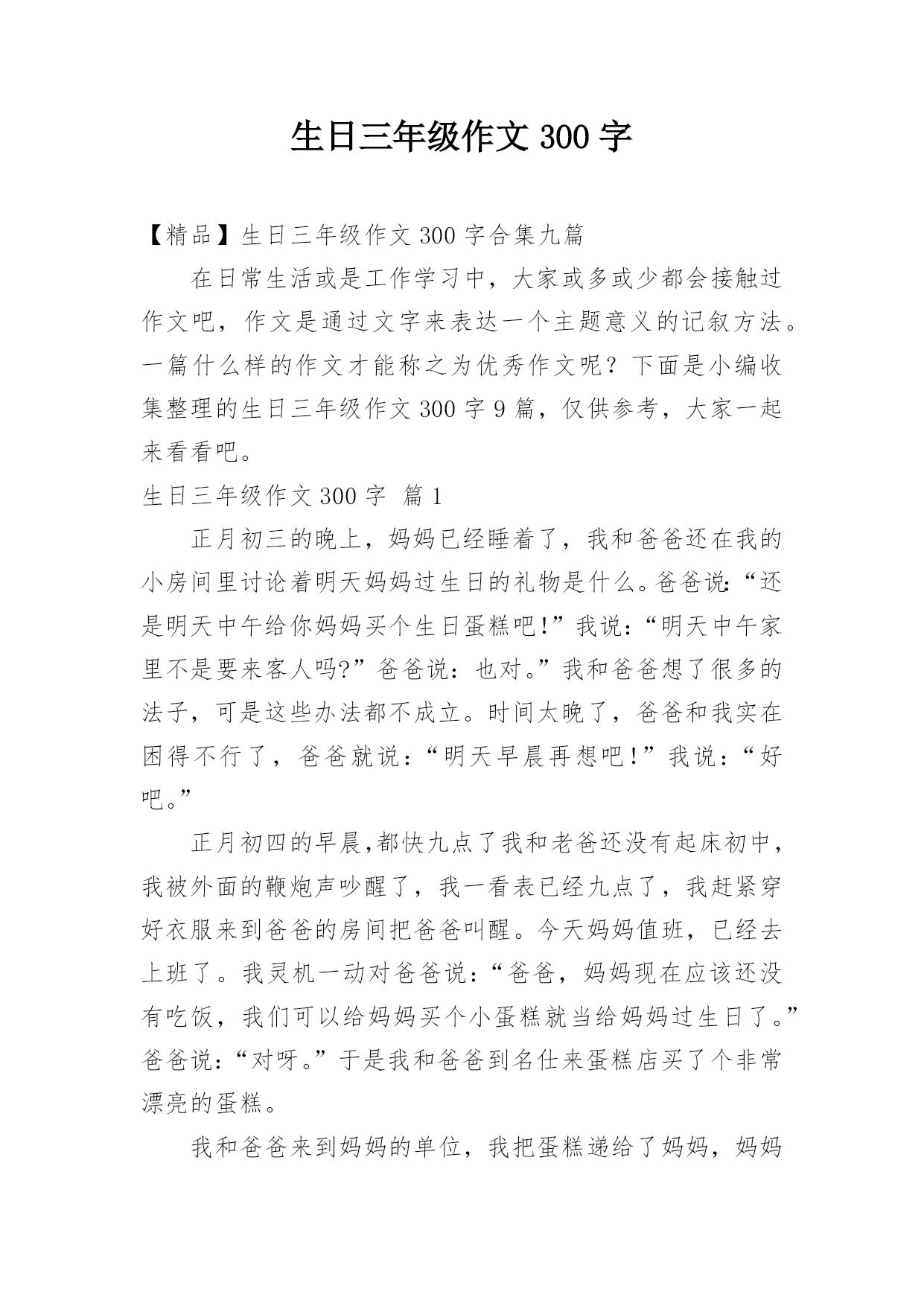 生日三年级作文300字【精品】生日三年级作文300字合集九篇在日常生活或是工作学习中,大家或多或少都会接触过作文吧,作文是通过文字来表达一个主题意义的记叙方法。一篇什么样的作文才能称之为优秀作文呢?下面是小编收集整理的生日三年级作文300字9篇,仅供参考,大家一起来看看吧。生日三年级作文300字篇1正月初三的晚上,妈妈已经睡着了,我和爸爸还在我的小房间里讨论着明天妈妈过生日的礼物是什么。爸爸说:“还是明天中午给你妈妈买个生日蛋糕吧!”我说:“明天中午家里不是要来客人吗?”爸爸说:也对。”我和爸爸想了很多的