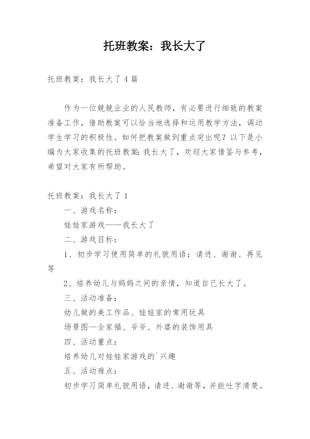 托班教案:我长大了托班教案:我长大了4篇作为一位兢兢业业的人民教师,有必要进行细致的教案准备工作,借助教案可以恰当地选择和运用教学方法,调动学生学习的积极性。如何把教案做到重点突出呢?以下是小编为大家收集的托班教案:我长大了,欢迎大家借鉴与参考,希望对大家有所帮助。托班教案:我长大了1一、游戏名称:娃娃家游戏——我长大了二、游戏目标:1、初步学习使用简单的礼貌用语:请进、谢谢、再见等2、培养幼儿与妈妈之间的亲情,知道自己长大了。三、活动准备:幼儿做的美工作品、娃娃家的常用玩具场景图—全家福、爷爷、外婆的装