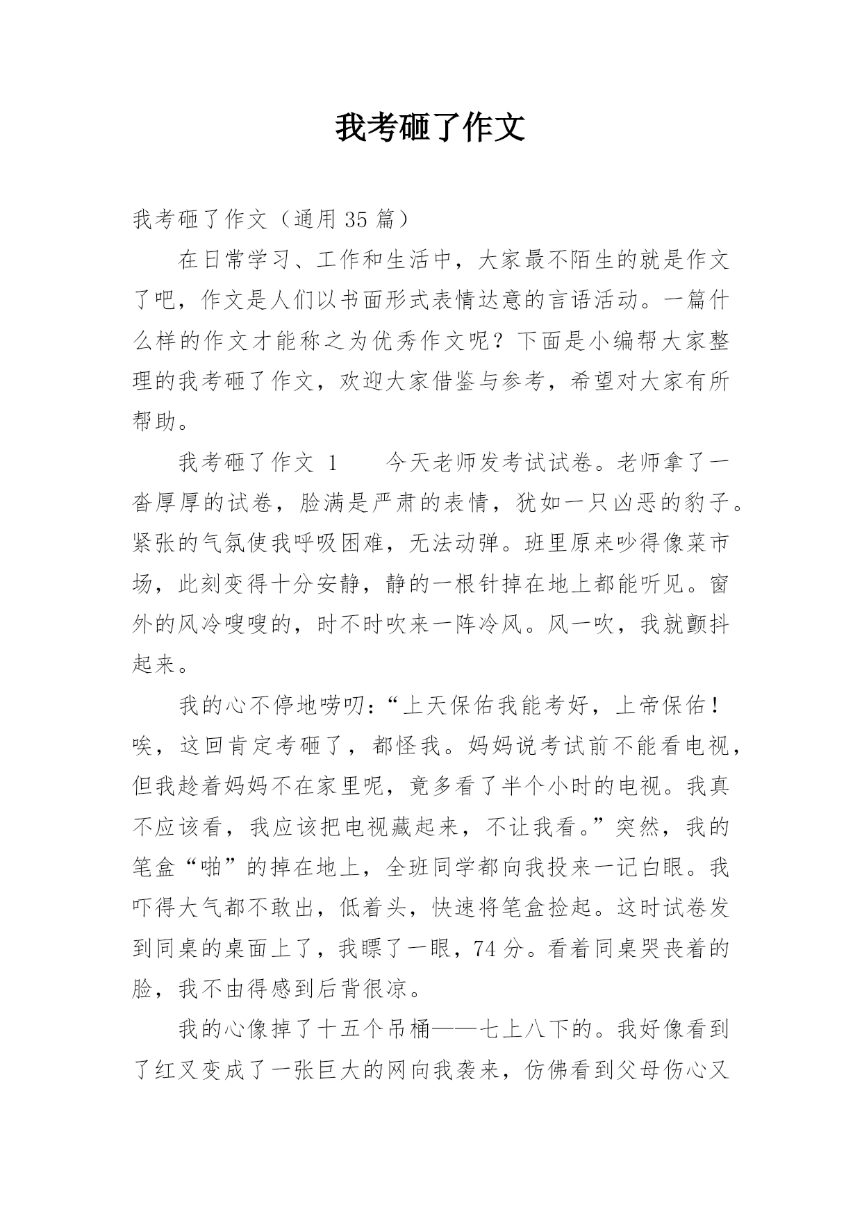 我考砸了作文我考砸了作文(通用35篇)在日常学习、工作和生活中,大家最不陌生的就是作文了吧,作文是人们以书面形式表情达意的言语活动。一篇什么样的作文才能称之为优秀作文呢?下面是小编帮大家整理的我考砸了作文,欢迎大家借鉴与参考,希望对大家有所帮助。我考砸了作文1今天老师发考试试卷。老师拿了一沓厚厚的试卷,脸满是严肃的表情,犹如一只凶恶的豹子。紧张的气氛使我呼吸困难,无法动弹。班里原来吵得像菜市场,此刻变得十分安静,静的一根针掉在地上都能听见。窗外的风冷嗖嗖的,时不时吹来一阵冷风。风一吹,我就颤抖起来。我的心