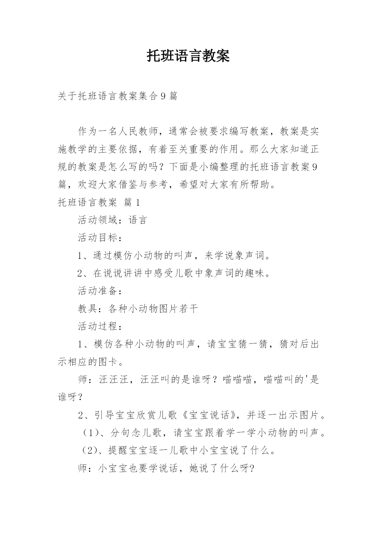 托班语言教案关于托班语言教案集合9篇作为一名人民教师,通常会被要求编写教案,教案是实施教学的主要依据,有着至关重要的作用。那么大家知道正规的教案是怎么写的吗?下面是小编整理的托班语言教案9篇,欢迎大家借鉴与参考,希望对大家有所帮助。托班语言教案篇1活动领域:语言活动目标:1、通过模仿小动物的叫声,来学说象声词。2、在说说讲讲中感受儿歌中象声词的趣味。活动准备:教具:各种小动物图片若干活动过程:1、模仿各种小动物的叫声,请宝宝猜一猜,猜对后出示相应的图卡。师:汪汪汪,汪汪叫的是谁呀?喵喵喵,喵喵叫的'是谁呀