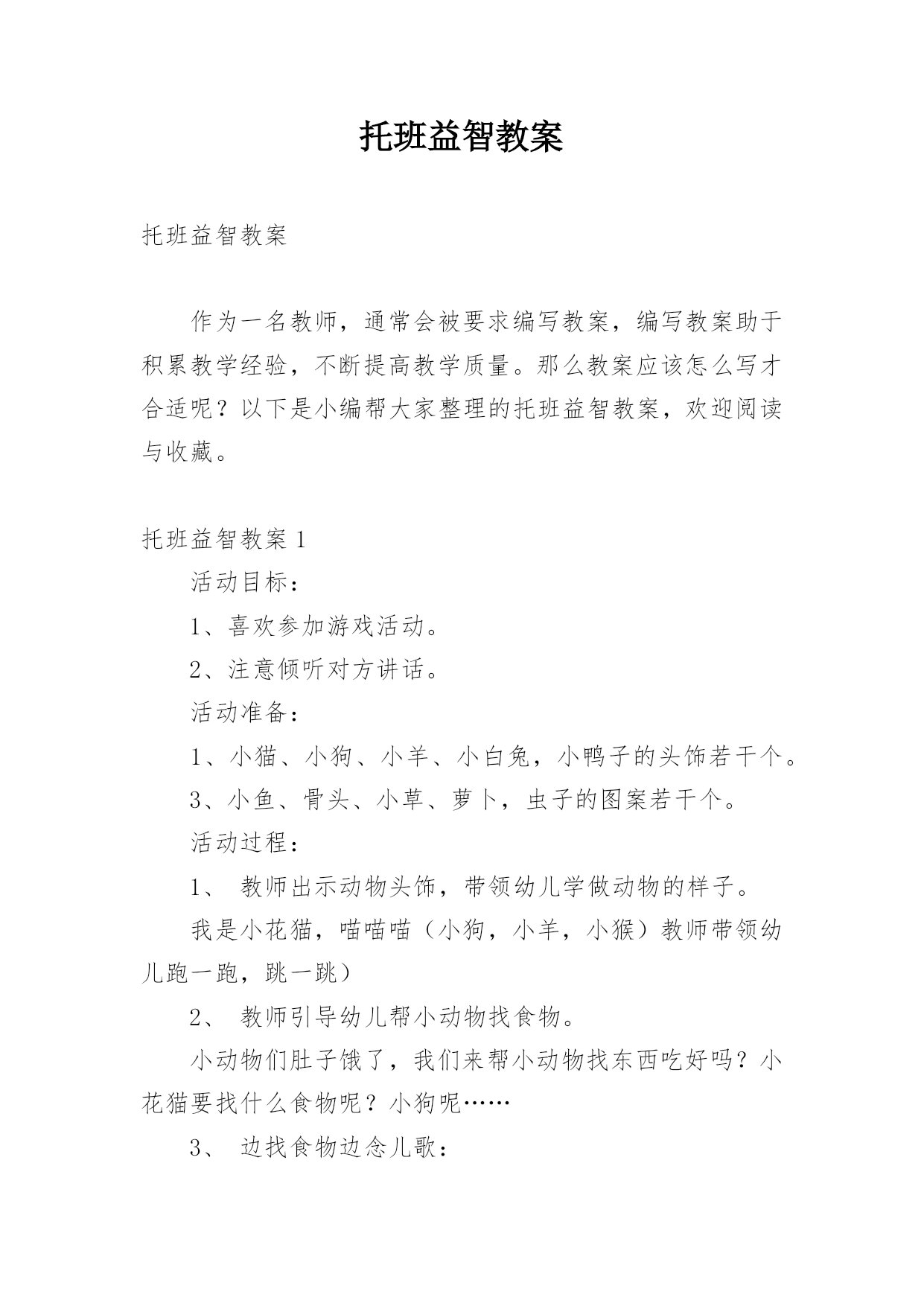 托班益智教案托班益智教案作为一名教师,通常会被要求编写教案,编写教案助于积累教学经验,不断提高教学质量。那么教案应该怎么写才合适呢?以下是小编帮大家整理的托班益智教案,欢迎阅读与收藏。托班益智教案1活动目标:1、喜欢参加游戏活动。2、注意倾听对方讲话。活动准备:1、小猫、小狗、小羊、小白兔,小鸭子的头饰若干个。3、小鱼、骨头、小草、萝卜,虫子的图案若干个。活动过程:1、教师出示动物头饰,带领幼儿学做动物的样子。我是小花猫,喵喵喵(小狗,小羊,小猴)教师带领幼儿跑一跑,跳一跳)2、教师引导幼儿帮小动物找食物