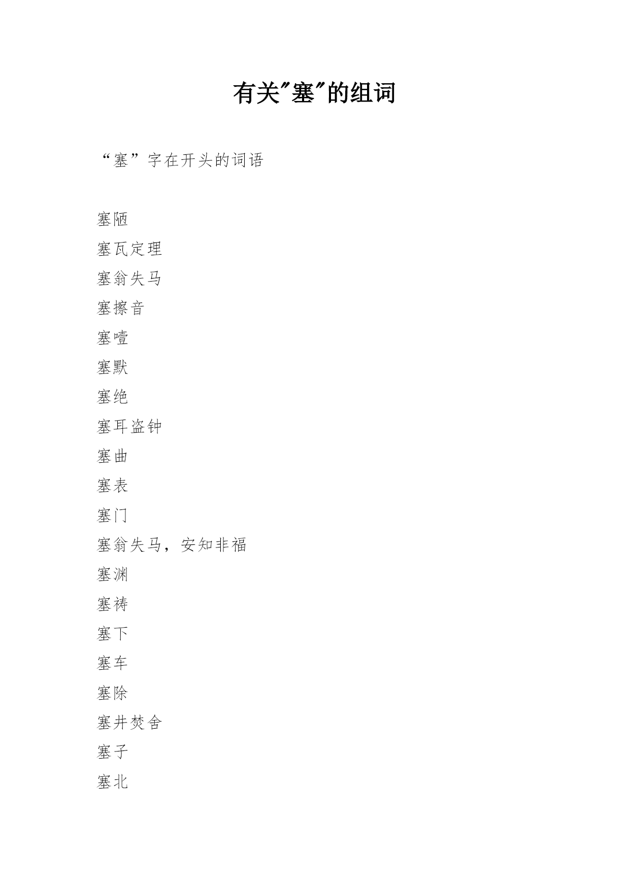 有关"塞"的组词“塞”字在开头的词语塞陋塞瓦定理塞翁失马塞擦音塞噎塞默塞绝塞耳盗钟塞曲塞表塞门塞翁失马,安知非福塞渊塞祷塞下塞车塞除塞井焚舍塞子塞北塞望塞上秋塞垣春塞人塞雁塞咎塞令塞诘塞思黑塞满塞声塞内加尔塞邦塞笳塞关塞塞塞耳塞角塞路塞途塞翁之马塞北江南塞鴈塞徼塞内塞责塞叟塞音塞包袱塞上曲塞翁失马,焉知非福“塞”字在中间的词语杜门塞窦两豆塞耳抑塞磊落潦草塞责树塞门闭门塞户加塞儿闭塞眼睛捉麻雀钵塞莫聊以塞责埃塞俄比亚高原敷衍塞责双豆塞耳赭衣塞路失马塞翁阿塞拜疆鹰犬塞途蔽聪塞明闭明塞聪充天塞地锢聪塞明钻山塞海