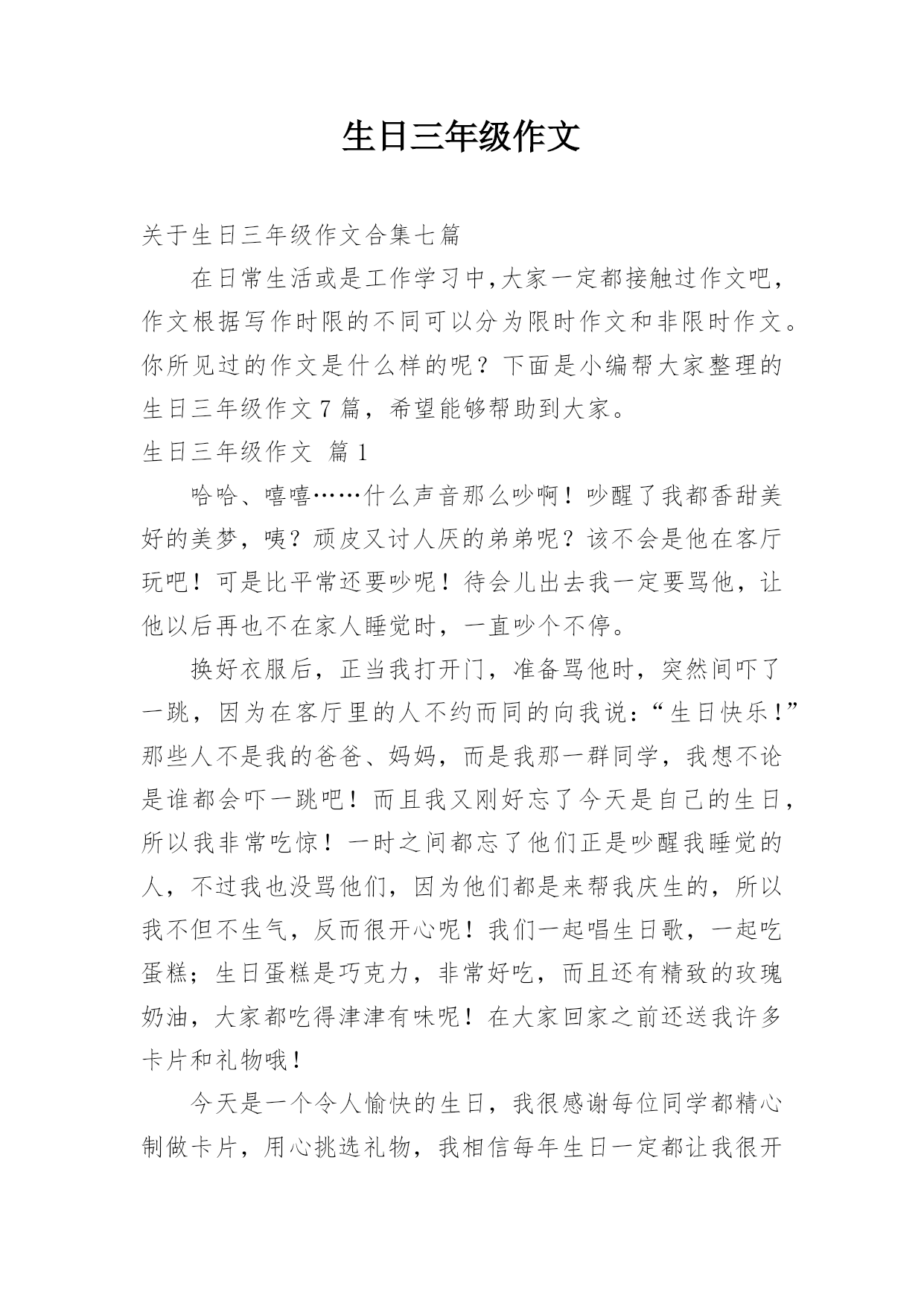 生日三年级作文关于生日三年级作文合集七篇在日常生活或是工作学习中,大家一定都接触过作文吧,作文根据写作时限的不同可以分为限时作文和非限时作文。你所见过的作文是什么样的呢?下面是小编帮大家整理的生日三年级作文7篇,希望能够帮助到大家。生日三年级作文篇1哈哈、嘻嘻……什么声音那么吵啊!吵醒了我都香甜美好的美梦,咦?顽皮又讨人厌的弟弟呢?该不会是他在客厅玩吧!可是比平常还要吵呢!待会儿出去我一定要骂他,让他以后再也不在家人睡觉时,一直吵个不停。换好衣服后,正当我打开门,准备骂他时,突然间吓了一跳,因为在客厅里的