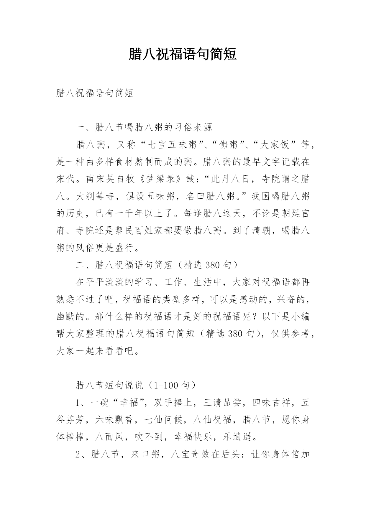 腊八祝福语句简短腊八祝福语句简短一、腊八节喝腊八粥的习俗来源腊八粥,又称“七宝五味粥”、“佛粥”、“大家饭”等,是一种由多样食材熬制而成的粥。腊八粥的最早文字记载在宋代。南宋吴自牧《梦梁录》载:“此月八日,寺院谓之腊八。大刹等寺,俱设五味粥,名曰腊八粥。”我国喝腊八粥的历史,已有一千年以上了。每逢腊八这天,不论是朝廷官府、寺院还是黎民百姓家都要做腊八粥。到了清朝,喝腊八粥的风俗更是盛行。二、腊八祝福语句简短(精选380句)在平平淡淡的学习、工作、生活中,大家对祝福语都再熟悉不过了吧,祝福语的类型多样,可以