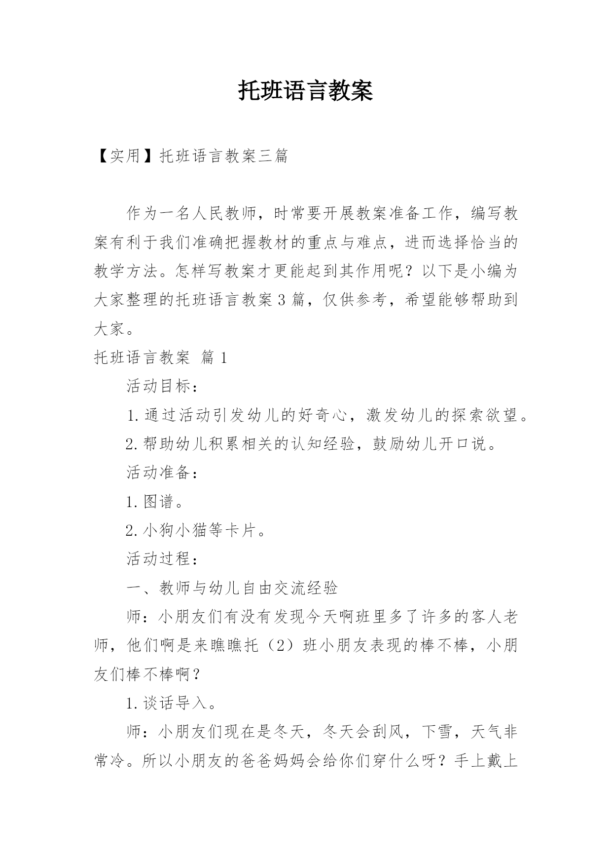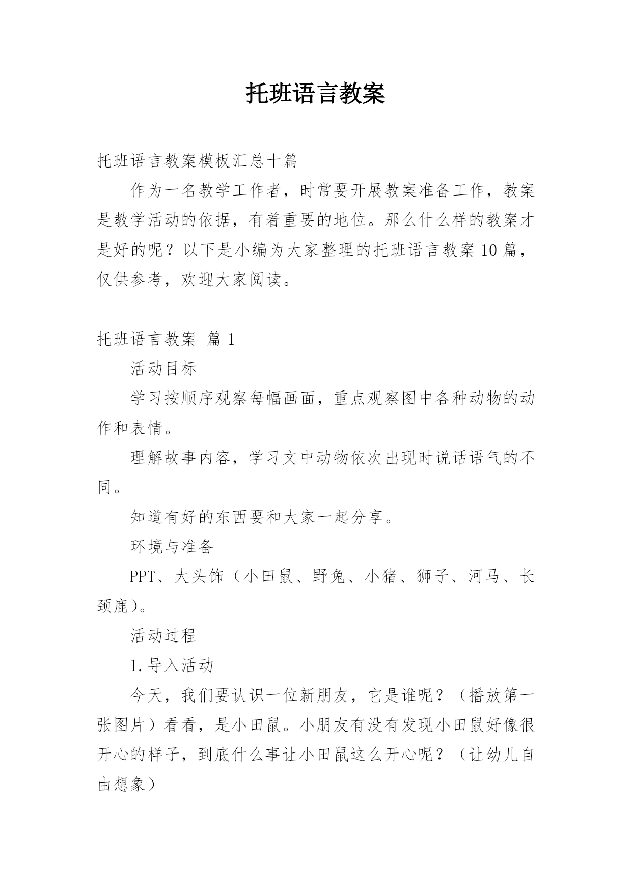 托班语言教案托班语言教案模板汇总十篇作为一名教学工作者,时常要开展教案准备工作,教案是教学活动的依据,有着重要的地位。那么什么样的教案才是好的呢?以下是小编为大家整理的托班语言教案10篇,仅供参考,欢迎大家阅读。托班语言教案篇1活动目标学习按顺序观察每幅画面,重点观察图中各种动物的动作和表情。理解故事内容,学习文中动物依次出现时说话语气的不同。知道有好的东西要和大家一起分享。环境与准备PPT、大头饰(小田鼠、野兔、小猪、狮子、河马、长颈鹿)。活动过程1.导入活动今天,我们要认识一位新朋友,它是谁呢?(播放