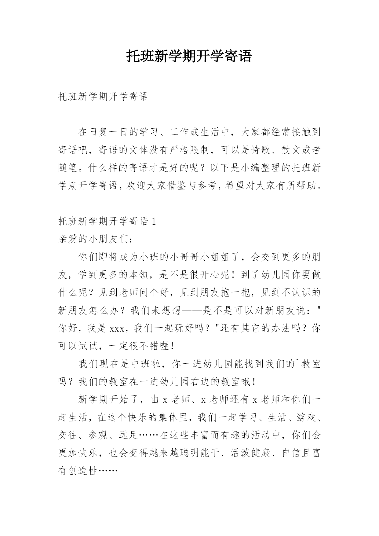 托班新学期开学寄语托班新学期开学寄语在日复一日的学习、工作或生活中,大家都经常接触到寄语吧,寄语的文体没有严格限制,可以是诗歌、散文或者随笔。什么样的寄语才是好的呢?以下是小编整理的托班新学期开学寄语,欢迎大家借鉴与参考,希望对大家有所帮助。托班新学期开学寄语1亲爱的小朋友们:你们即将成为小班的小哥哥小姐姐了,会交到更多的朋友,学到更多的本领,是不是很开心呢!到了幼儿园你要做什么呢?见到老师问个好,见到朋友抱一抱,见到不认识的新朋友怎么办?我们来想想——是不是可以对新朋友说:"你好,我是xxx,我们一起玩