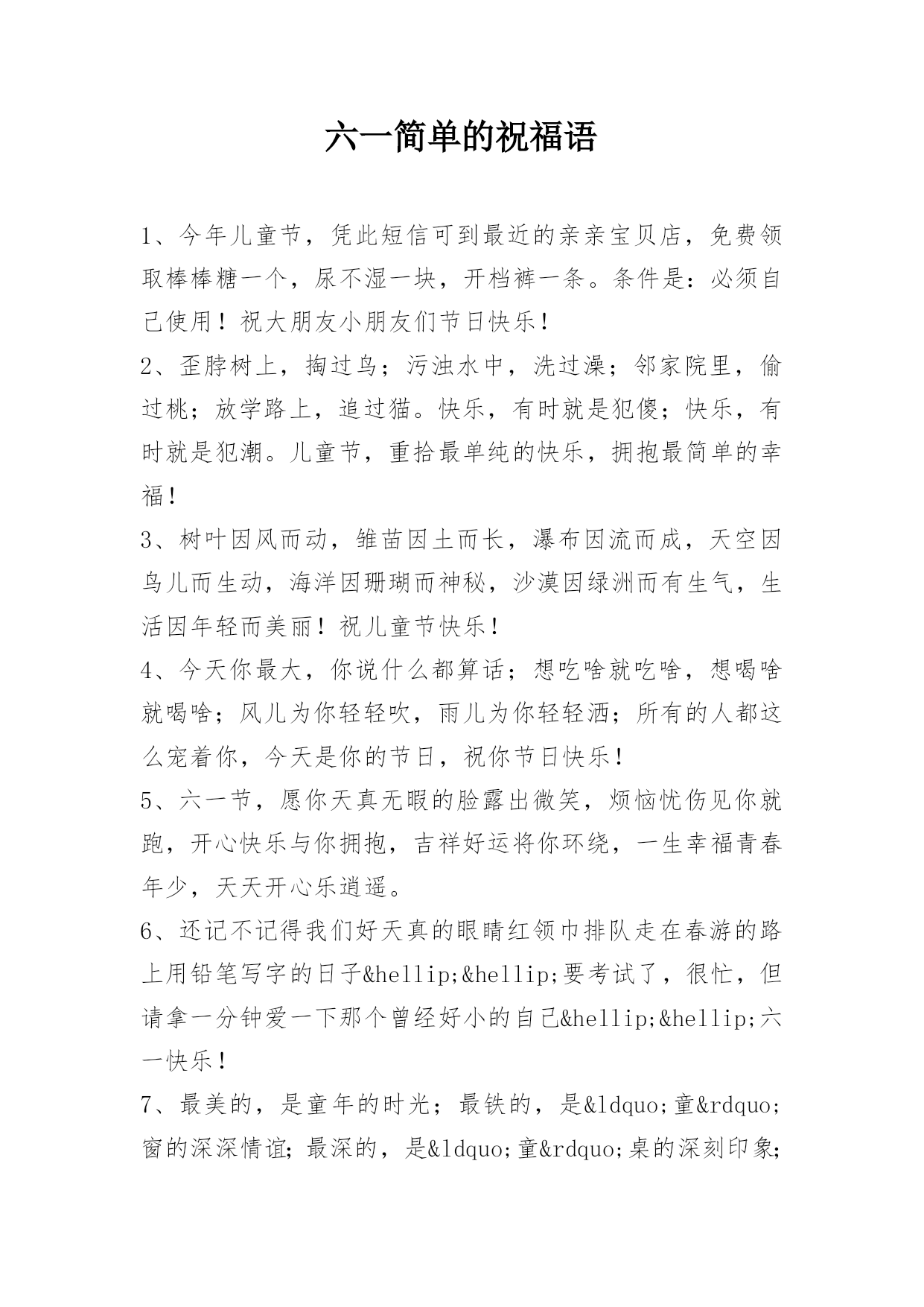 六一简单的祝福语1、今年儿童节,凭此短信可到最近的亲亲宝贝店,免费领取棒棒糖一个,尿不湿一块,开档裤一条。条件是:必须自己使用!祝大朋友小朋友们节日快乐!2、歪脖树上,掏过鸟;污浊水中,洗过澡;邻家院里,偷过桃;放学路上,追过猫。快乐,有时就是犯傻;快乐,有时就是犯潮。儿童节,重拾最单纯的快乐,拥抱最简单的幸福!3、树叶因风而动,雏苗因土而长,瀑布因流而成,天空因鸟儿而生动,海洋因珊瑚而神秘,沙漠因绿洲而有生气,生活因年轻而美丽!祝儿童节快乐!4、今天你最大,你说什么都算话;想吃啥就吃啥,想喝啥就喝啥;风