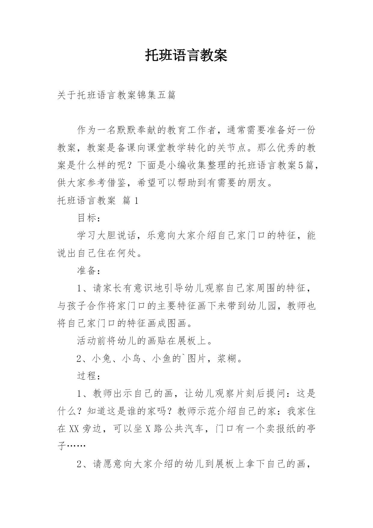 托班语言教案关于托班语言教案锦集五篇作为一名默默奉献的教育工作者,通常需要准备好一份教案,教案是备课向课堂教学转化的关节点。那么优秀的教案是什么样的呢?下面是小编收集整理的托班语言教案5篇,供大家参考借鉴,希望可以帮助到有需要的朋友。托班语言教案篇1目标:学习大胆说话,乐意向大家介绍自己家门口的特征,能说出自己住在何处。准备:1、请家长有意识地引导幼儿观察自己家周围的特征,与孩子合作将家门口的主要特征画下来带到幼儿园,教师也将自己家门口的特征画成图画。活动前将幼儿的画贴在展板上。2、小兔、小鸟、小鱼的`图