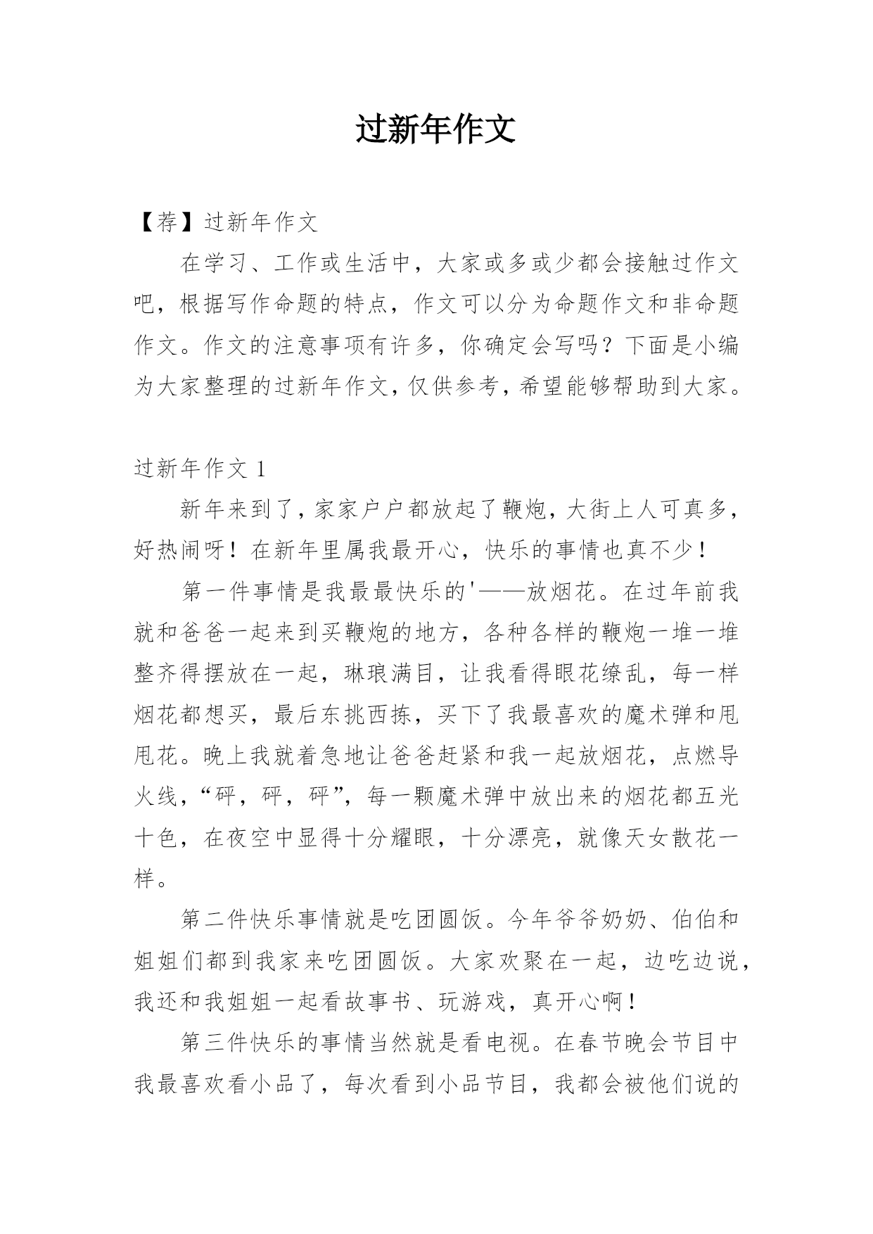 过新年作文【荐】过新年作文在学习、工作或生活中,大家或多或少都会接触过作文吧,根据写作命题的特点,作文可以分为命题作文和非命题作文。作文的注意事项有许多,你确定会写吗?下面是小编为大家整理的过新年作文,仅供参考,希望能够帮助到大家。过新年作文1新年来到了,家家户户都放起了鞭炮,大街上人可真多,好热闹呀!在新年里属我最开心,快乐的事情也真不少!第一件事情是我最最快乐的'——放烟花。在过年前我就和爸爸一起来到买鞭炮的地方,各种各样的鞭炮一堆一堆整齐得摆放在一起,琳琅满目,让我看得眼花缭乱,每一样烟花都想买,最