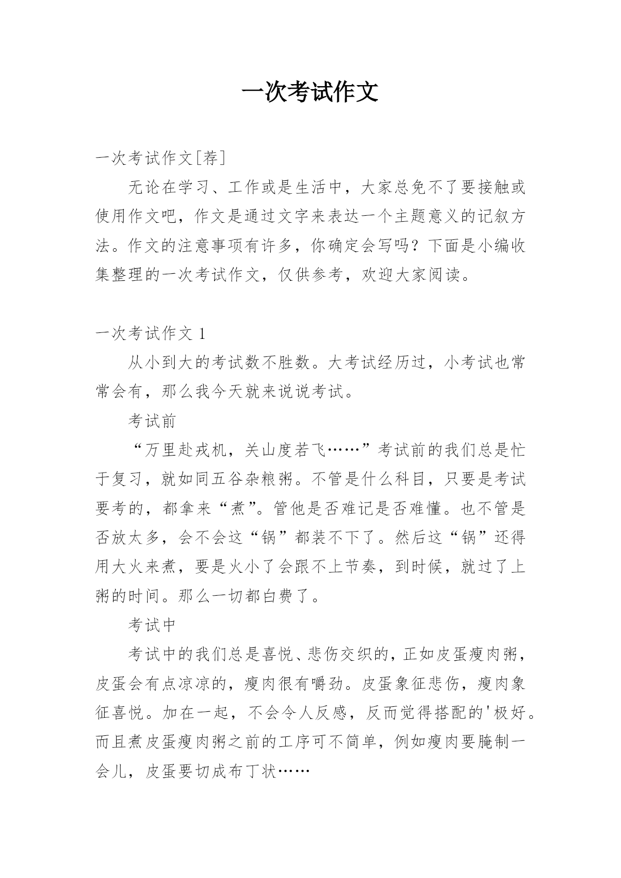 一次考试作文一次考试作文[荐]无论在学习、工作或是生活中,大家总免不了要接触或使用作文吧,作文是通过文字来表达一个主题意义的记叙方法。作文的注意事项有许多,你确定会写吗?下面是小编收集整理的一次考试作文,仅供参考,欢迎大家阅读。一次考试作文1从小到大的考试数不胜数。大考试经历过,小考试也常常会有,那么我今天就来说说考试。考试前“万里赴戎机,关山度若飞……”考试前的我们总是忙于复习,就如同五谷杂粮粥。不管是什么科目,只要是考试要考的,都拿来“煮”。管他是否难记是否难懂。也不管是否放太多,会不会这“锅”都装不