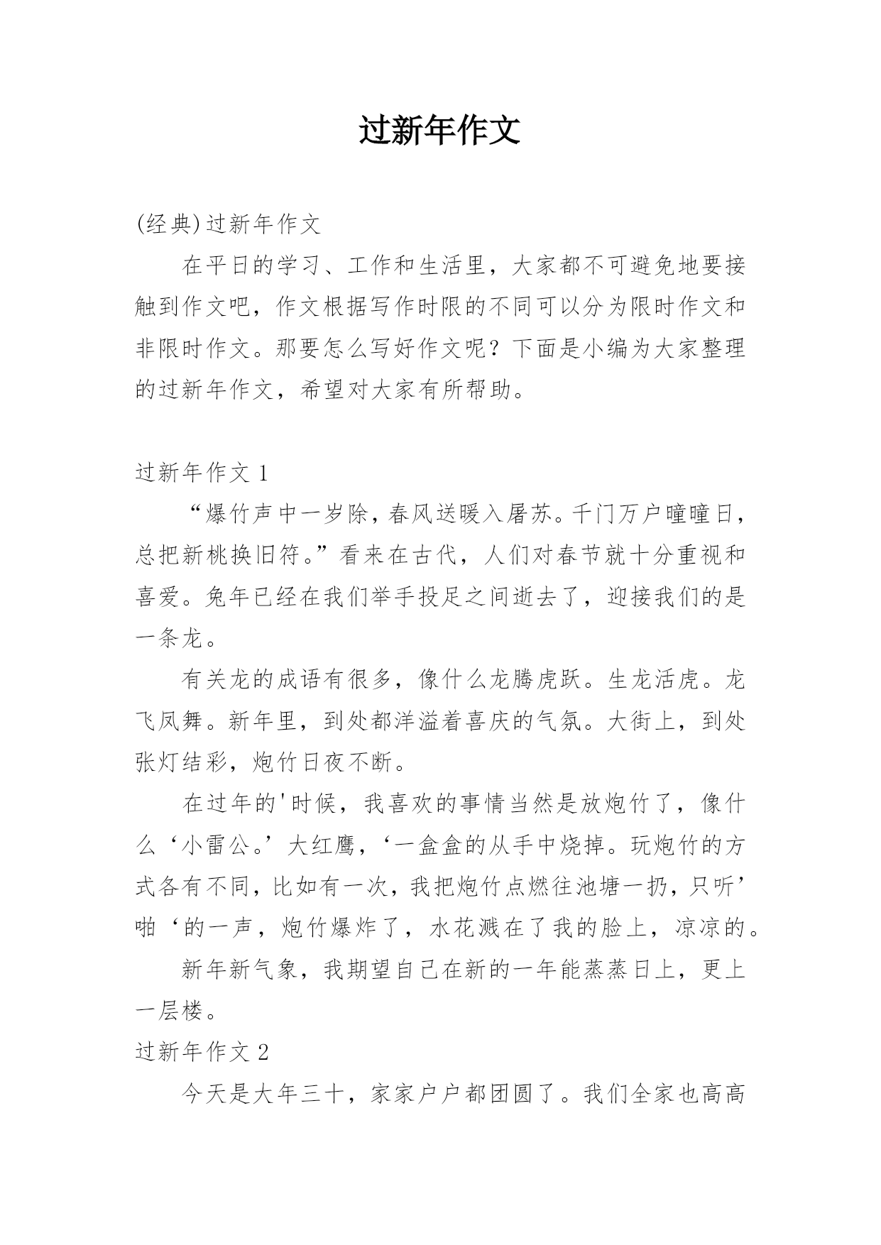 过新年作文(经典)过新年作文在平日的学习、工作和生活里,大家都不可避免地要接触到作文吧,作文根据写作时限的不同可以分为限时作文和非限时作文。那要怎么写好作文呢?下面是小编为大家整理的过新年作文,希望对大家有所帮助。过新年作文1“爆竹声中一岁除,春风送暖入屠苏。千门万户曈曈日,总把新桃换旧符。”看来在古代,人们对春节就十分重视和喜爱。兔年已经在我们举手投足之间逝去了,迎接我们的是一条龙。有关龙的成语有很多,像什么龙腾虎跃。生龙活虎。龙飞凤舞。新年里,到处都洋溢着喜庆的气氛。大街上,到处张灯结彩,炮竹日夜不断