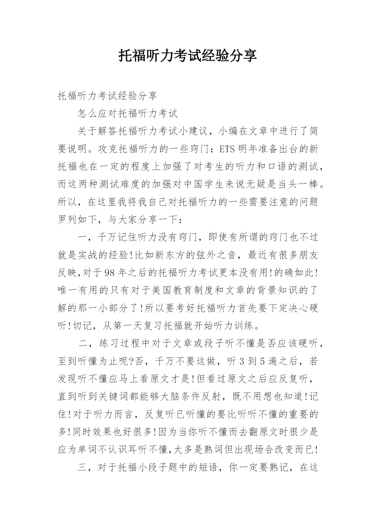 托福听力考试经验分享托福听力考试经验分享怎么应对托福听力考试关于解答托福听力考试小建议,小编在文章中进行了简要说明。攻克托福听力的一些窍门:ETS明年准备出台的新托福也在一定的程度上加强了对考生的听力和口语的测试,而这两种测试难度的加强对中国学生来说无疑是当头一棒。所以,在这里我将我自己对托福听力的一些需要注意的问题罗列如下,与大家分享一下:一,千万记住听力没有窍门,即使有所谓的窍门也不过就是实战的经验!比如新东方的弦外之音,最近有很多朋友反映,对于98年之后的托福听力考试更本没有用!的确如此!唯一有用的