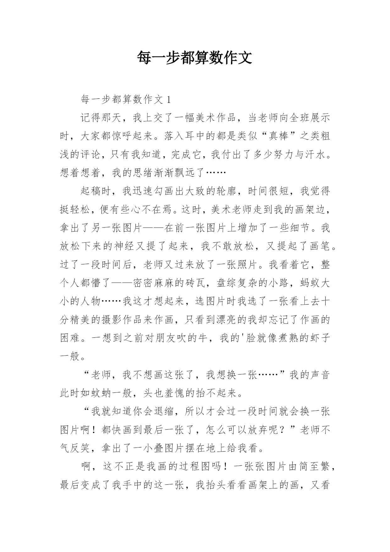 每一步都算数作文每一步都算数作文1记得那天,我上交了一幅美术作品,当老师向全班展示时,大家都惊呼起来。落入耳中的都是类似“真棒”之类粗浅的评论,只有我知道,完成它,我付出了多少努力与汗水。想着想着,我的思绪渐渐飘远了……起稿时,我迅速勾画出大致的轮廓,时间很短,我觉得挺轻松,便有些心不在焉。这时,美术老师走到我的画架边,拿出了另一张图片——在前一张图片上增加了一些细节。我放松下来的神经又提了起来,我不敢放松,又提起了画笔。过了一段时间后,老师又过来放了一张照片。我看着它,整个人都懵了——密密麻麻的砖瓦,盘