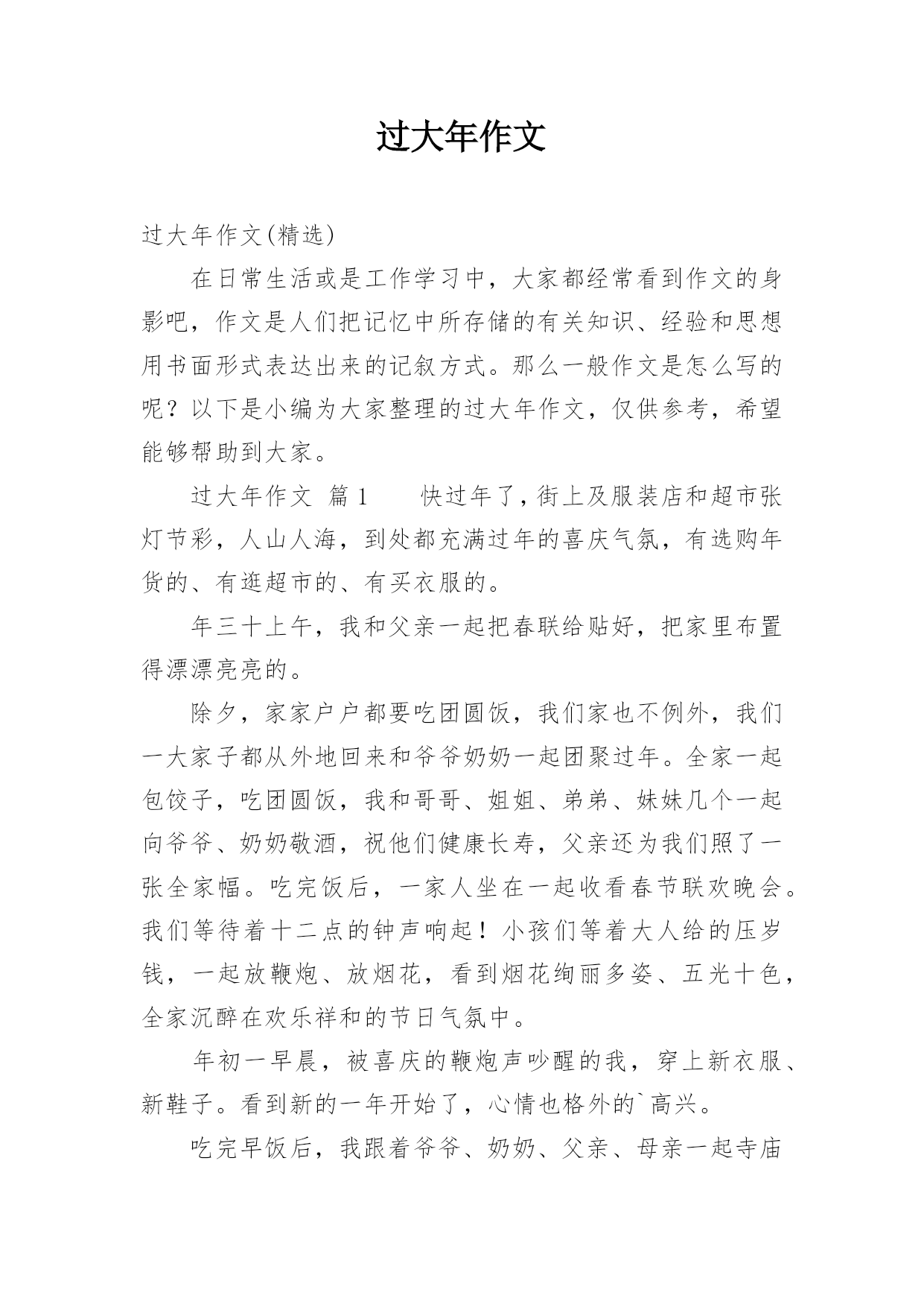 过大年作文过大年作文(精选)在日常生活或是工作学习中,大家都经常看到作文的身影吧,作文是人们把记忆中所存储的有关知识、经验和思想用书面形式表达出来的记叙方式。那么一般作文是怎么写的呢?以下是小编为大家整理的过大年作文,仅供参考,希望能够帮助到大家。过大年作文篇1快过年了,街上及服装店和超市张灯节彩,人山人海,到处都充满过年的喜庆气氛,有选购年货的、有逛超市的、有买衣服的。年三十上午,我和父亲一起把春联给贴好,把家里布置得漂漂亮亮的。除夕,家家户户都要吃团圆饭,我们家也不例外,我们一大家子都从外地回来和爷爷
