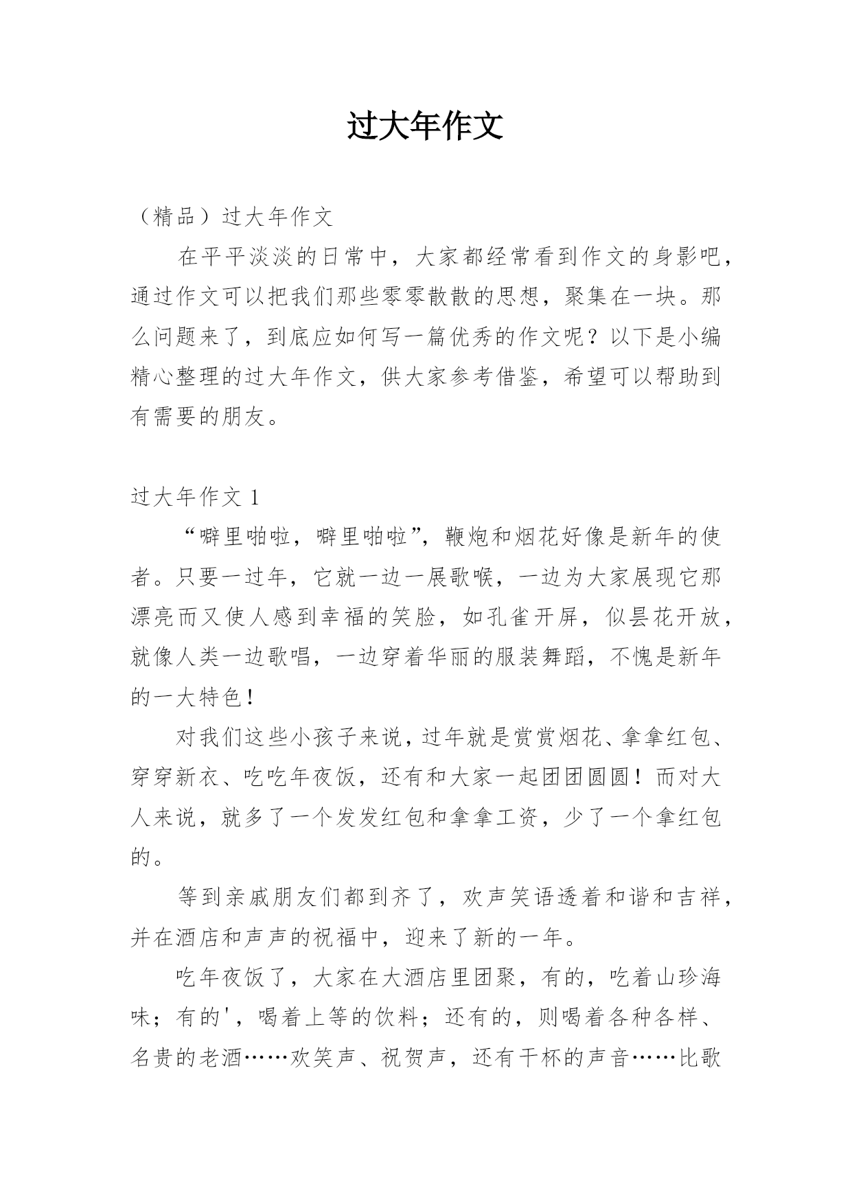 过大年作文(精品)过大年作文在平平淡淡的日常中,大家都经常看到作文的身影吧,通过作文可以把我们那些零零散散的思想,聚集在一块。那么问题来了,到底应如何写一篇优秀的作文呢?以下是小编精心整理的过大年作文,供大家参考借鉴,希望可以帮助到有需要的朋友。过大年作文1“噼里啪啦,噼里啪啦”,鞭炮和烟花好像是新年的使者。只要一过年,它就一边一展歌喉,一边为大家展现它那漂亮而又使人感到幸福的笑脸,如孔雀开屏,似昙花开放,就像人类一边歌唱,一边穿着华丽的服装舞蹈,不愧是新年的一大特色!对我们这些小孩子来说,过年就是赏赏烟
