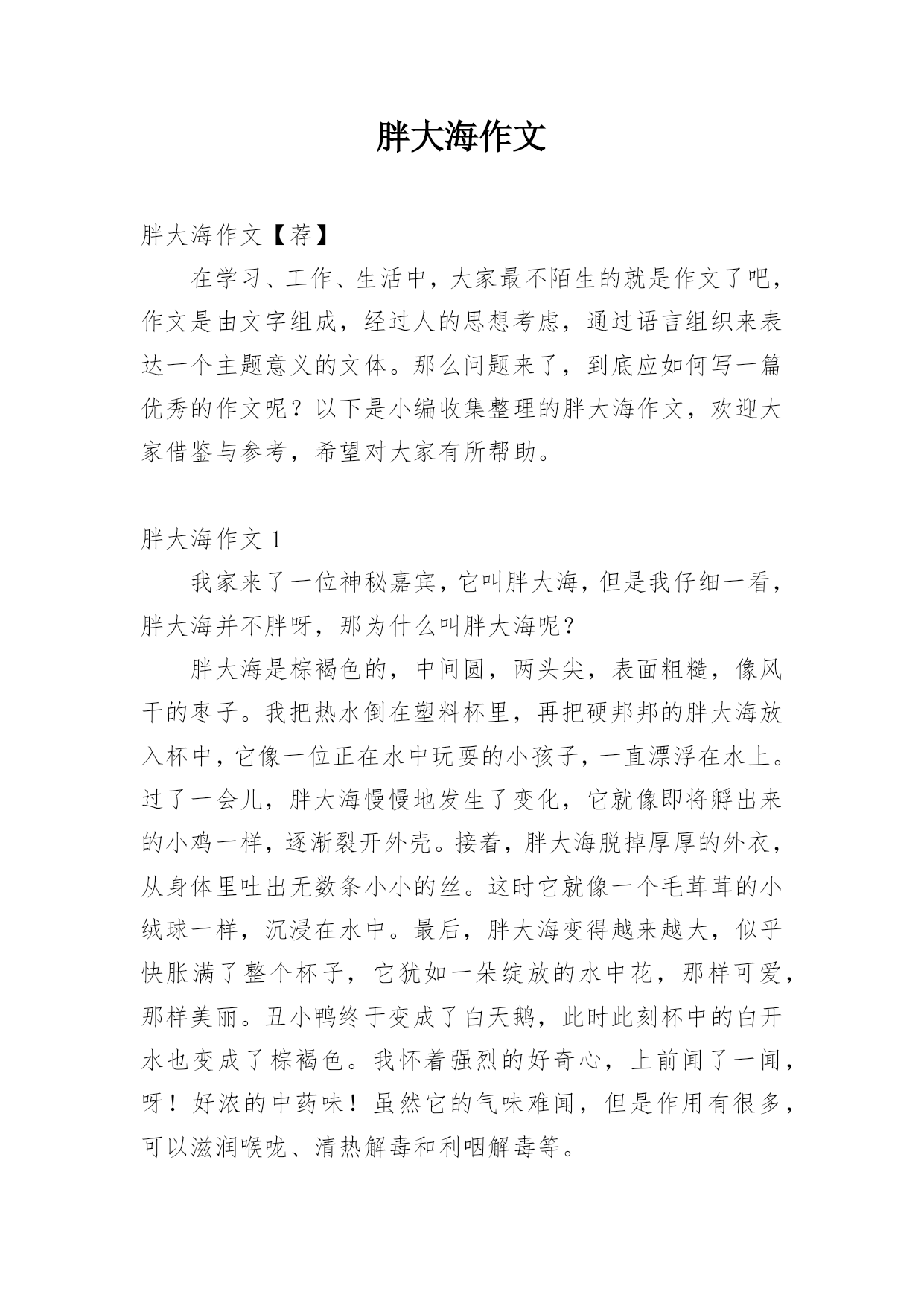 胖大海作文胖大海作文【荐】在学习、工作、生活中,大家最不陌生的就是作文了吧,作文是由文字组成,经过人的思想考虑,通过语言组织来表达一个主题意义的文体。那么问题来了,到底应如何写一篇优秀的作文呢?以下是小编收集整理的胖大海作文,欢迎大家借鉴与参考,希望对大家有所帮助。胖大海作文1我家来了一位神秘嘉宾,它叫胖大海,但是我仔细一看,胖大海并不胖呀,那为什么叫胖大海呢?胖大海是棕褐色的,中间圆,两头尖,表面粗糙,像风干的枣子。我把热水倒在塑料杯里,再把硬邦邦的胖大海放入杯中,它像一位正在水中玩耍的小孩子,一直漂浮