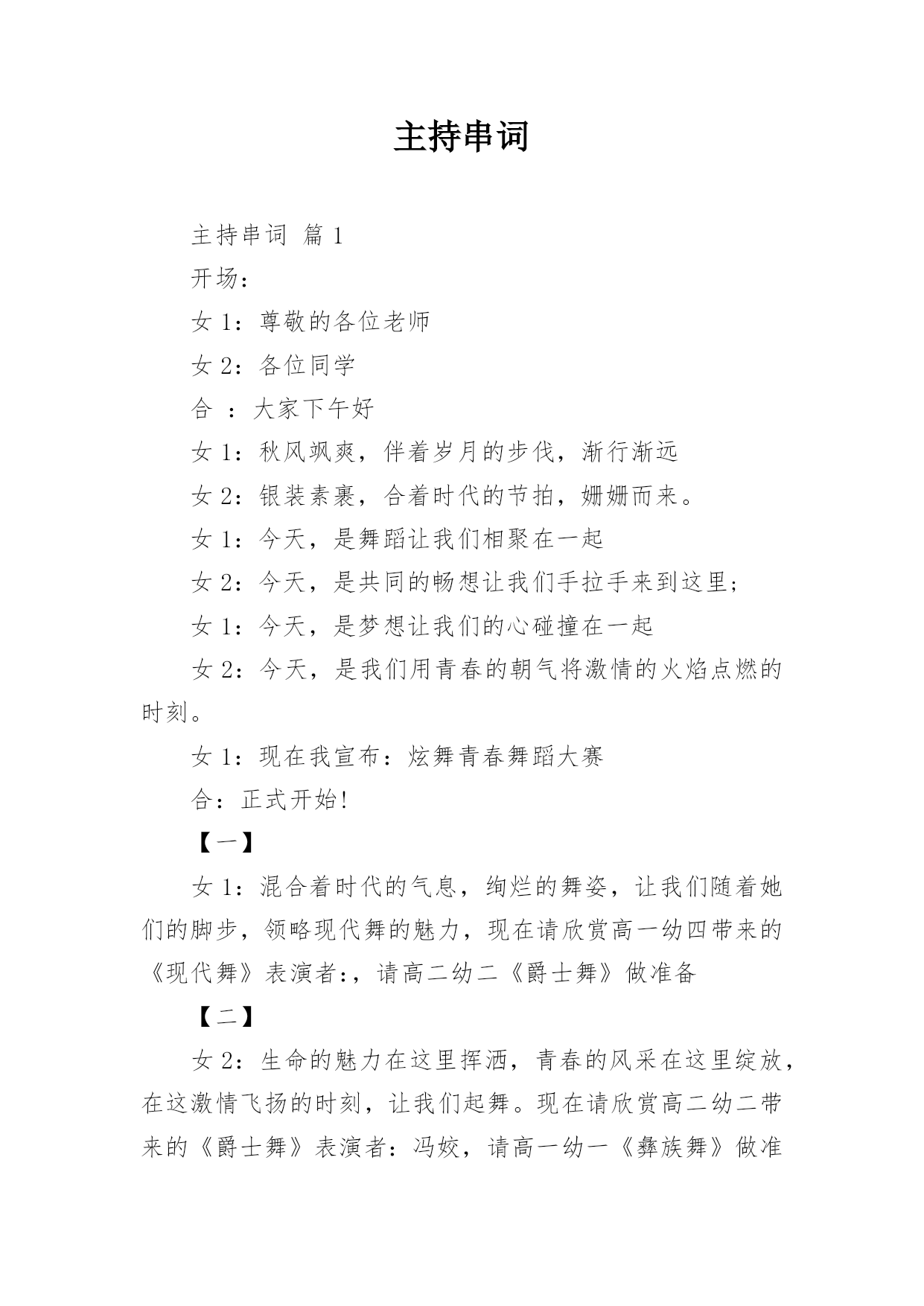 主持串词主持串词篇1开场:女1:尊敬的各位老师女2:各位同学合:大家下午好女1:秋风飒爽,伴着岁月的步伐,渐行渐远女2:银装素裹,合着时代的节拍,姗姗而来。女1:今天,是舞蹈让我们相聚在一起女2:今天,是共同的畅想让我们手拉手来到这里;女1:今天,是梦想让我们的心碰撞在一起女2:今天,是我们用青春的朝气将激情的火焰点燃的时刻。女1:现在我宣布:炫舞青春舞蹈大赛合:正式开始!【一】女1:混合着时代的气息,绚烂的舞姿,让我们随着她们的脚步,领略现代舞的魅力,现在请欣赏高一幼四带来的《现代舞》表演者:,请高二幼