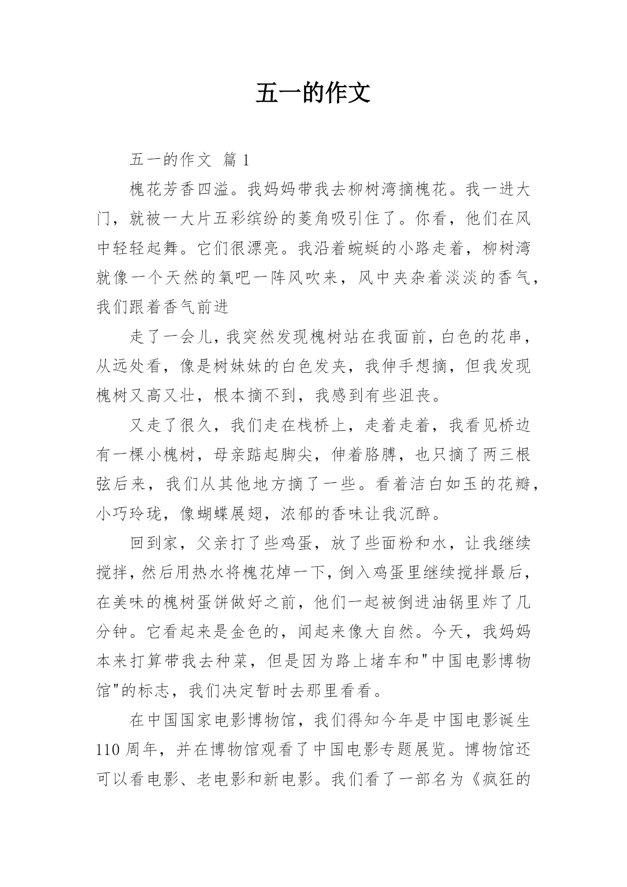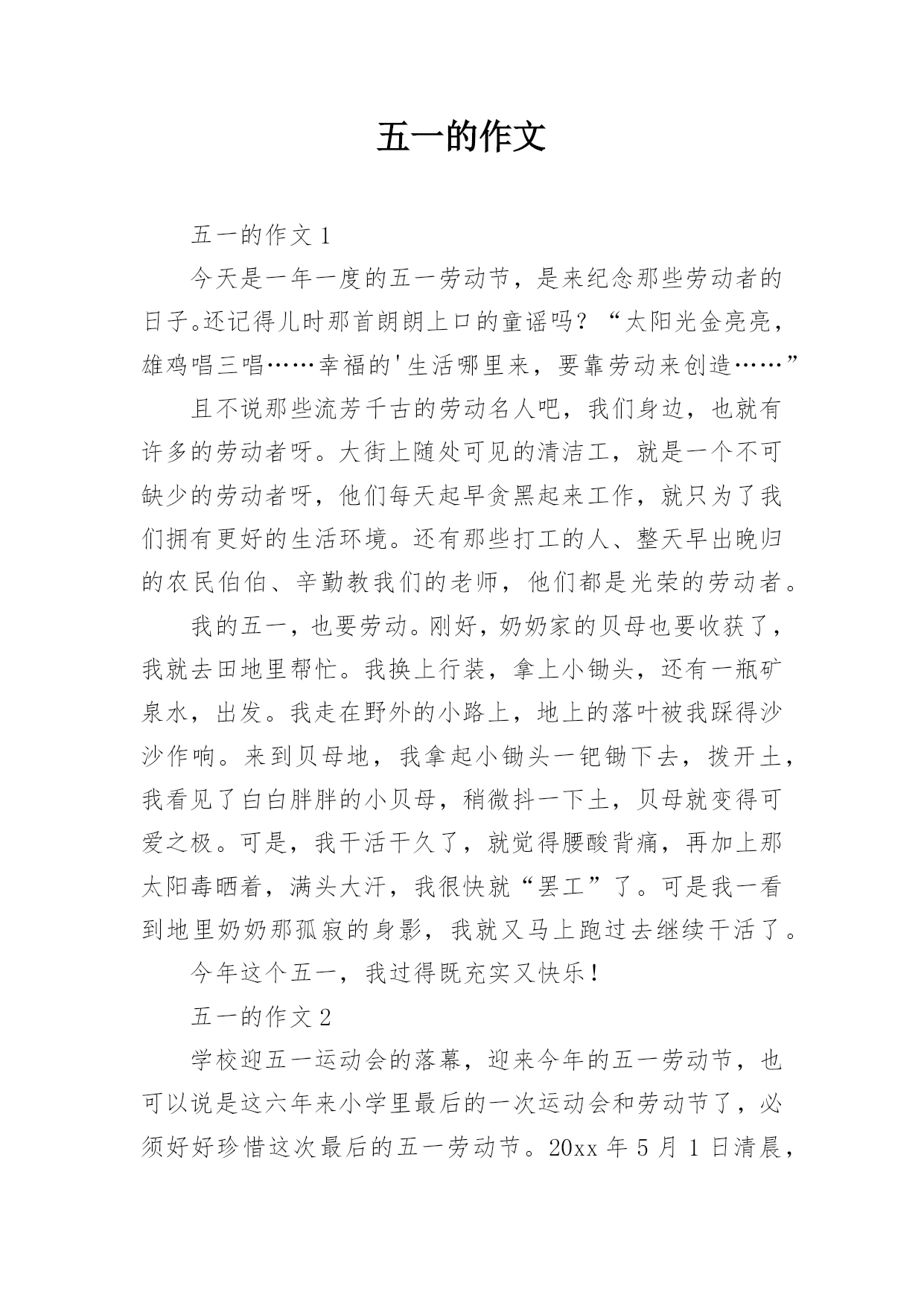 五一的作文五一的作文1今天是一年一度的五一劳动节,是来纪念那些劳动者的日子。还记得儿时那首朗朗上口的童谣吗?“太阳光金亮亮,雄鸡唱三唱……幸福的'生活哪里来,要靠劳动来创造……”且不说那些流芳千古的劳动名人吧,我们身边,也就有许多的劳动者呀。大街上随处可见的清洁工,就是一个不可缺少的劳动者呀,他们每天起早贪黑起来工作,就只为了我们拥有更好的生活环境。还有那些打工的人、整天早出晚归的农民伯伯、辛勤教我们的老师,他们都是光荣的劳动者。我的五一,也要劳动。刚好,奶奶家的贝母也要收获了,我就去田地里帮忙。我换上行