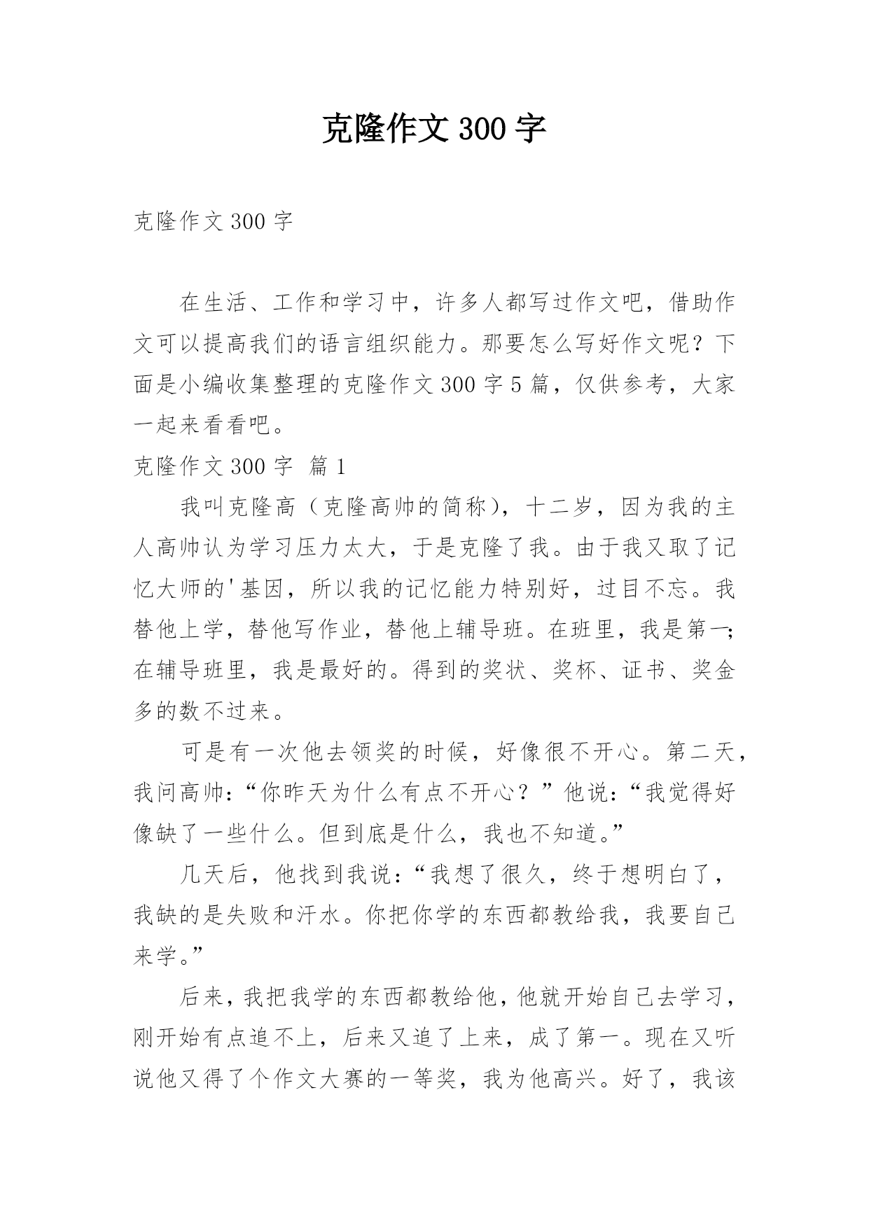 克隆作文300字克隆作文300字在生活、工作和学习中,许多人都写过作文吧,借助作文可以提高我们的语言组织能力。那要怎么写好作文呢?下面是小编收集整理的克隆作文300字5篇,仅供参考,大家一起来看看吧。克隆作文300字篇1我叫克隆高(克隆高帅的简称),十二岁,因为我的主人高帅认为学习压力太大,于是克隆了我。由于我又取了记忆大师的'基因,所以我的记忆能力特别好,过目不忘。我替他上学,替他写作业,替他上辅导班。在班里,我是第一;在辅导班里,我是最好的。得到的奖状、奖杯、证书、奖金多的数不过来。可是有一次他去领奖