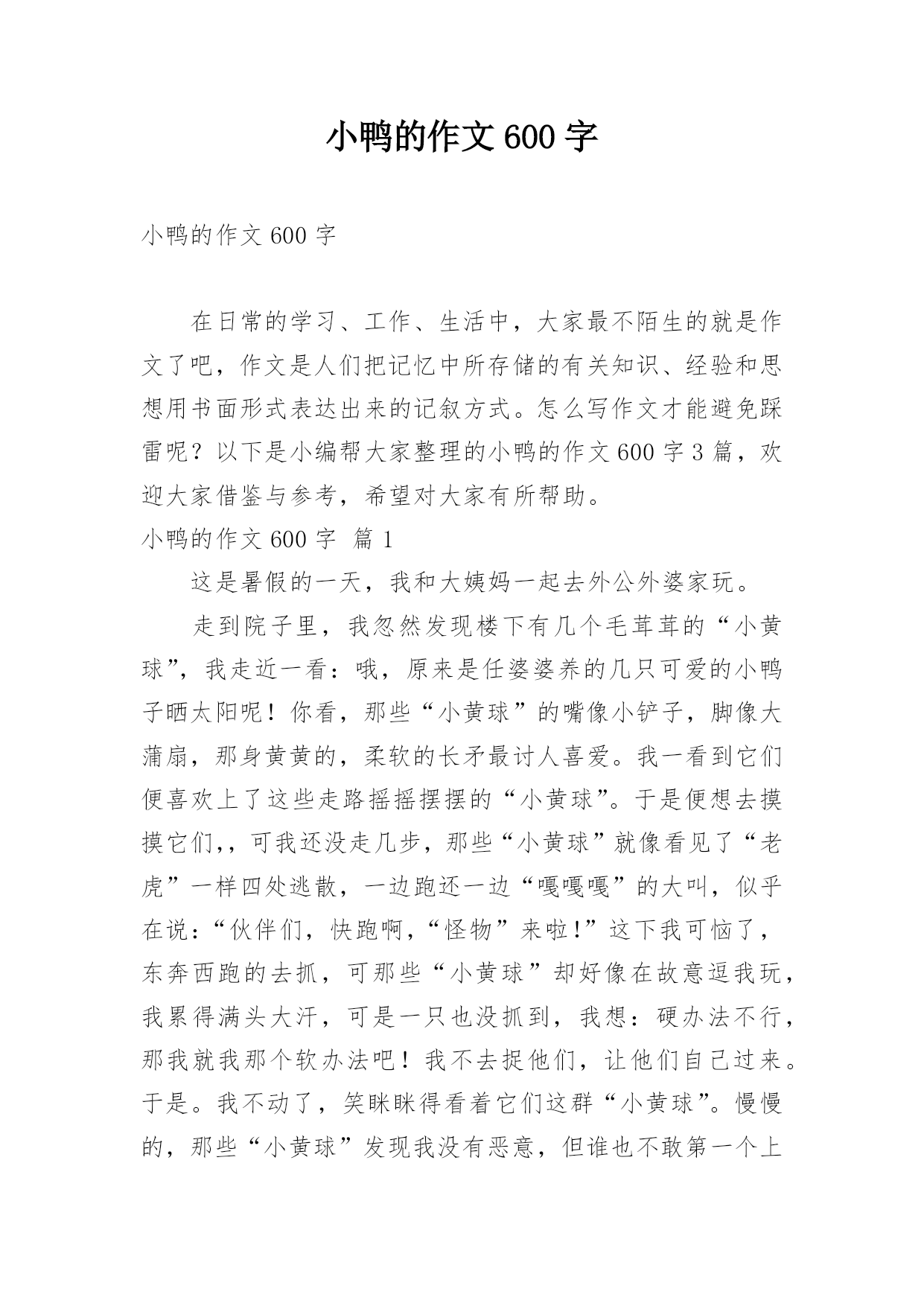小鸭的作文600字小鸭的作文600字在日常的学习、工作、生活中,大家最不陌生的就是作文了吧,作文是人们把记忆中所存储的有关知识、经验和思想用书面形式表达出来的记叙方式。怎么写作文才能避免踩雷呢?以下是小编帮大家整理的小鸭的作文600字3篇,欢迎大家借鉴与参考,希望对大家有所帮助。小鸭的作文600字篇1这是暑假的一天,我和大姨妈一起去外公外婆家玩。走到院子里,我忽然发现楼下有几个毛茸茸的“小黄球”,我走近一看:哦,原来是任婆婆养的几只可爱的小鸭子晒太阳呢!你看,那些“小黄球”的嘴像小铲子,脚像大蒲扇,那身黄