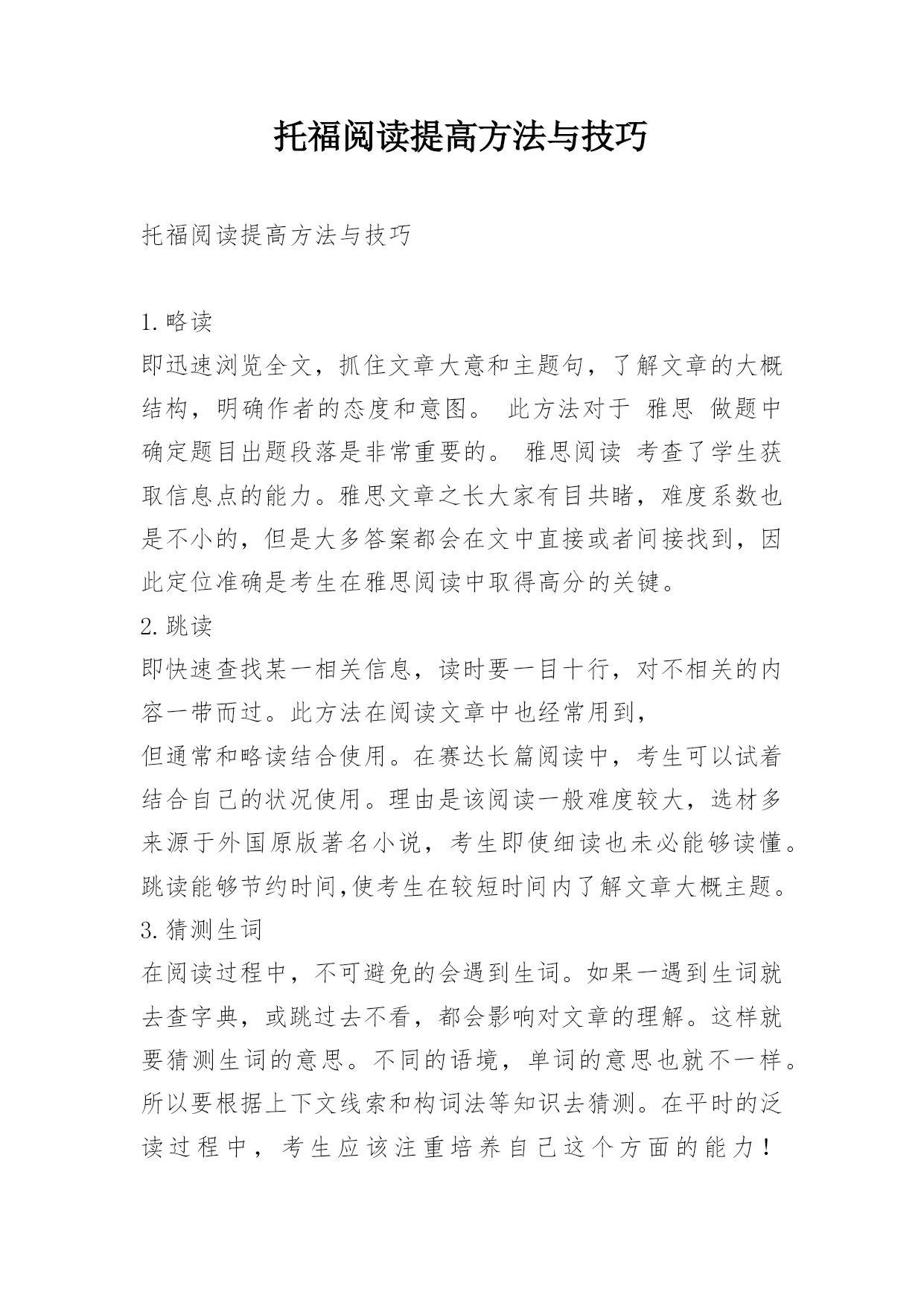 托福阅读提高方法与技巧托福阅读提高方法与技巧1.略读即迅速浏览全文,抓住文章大意和主题句,了解文章的大概结构,明确作者的态度和意图。此方法对于雅思做题中确定题目出题段落是非常重要的。雅思阅读考查了学生获取信息点的能力。雅思文章之长大家有目共睹,难度系数也是不小的,但是大多答案都会在文中直接或者间接找到,因此定位准确是考生在雅思阅读中取得高分的关键。2.跳读即快速查找某一相关信息,读时要一目十行,对不相关的内容一带而过。此方法在阅读文章中也经常用到,但通常和略读结合使用。在赛达长篇阅读中,考生可以试着结合自