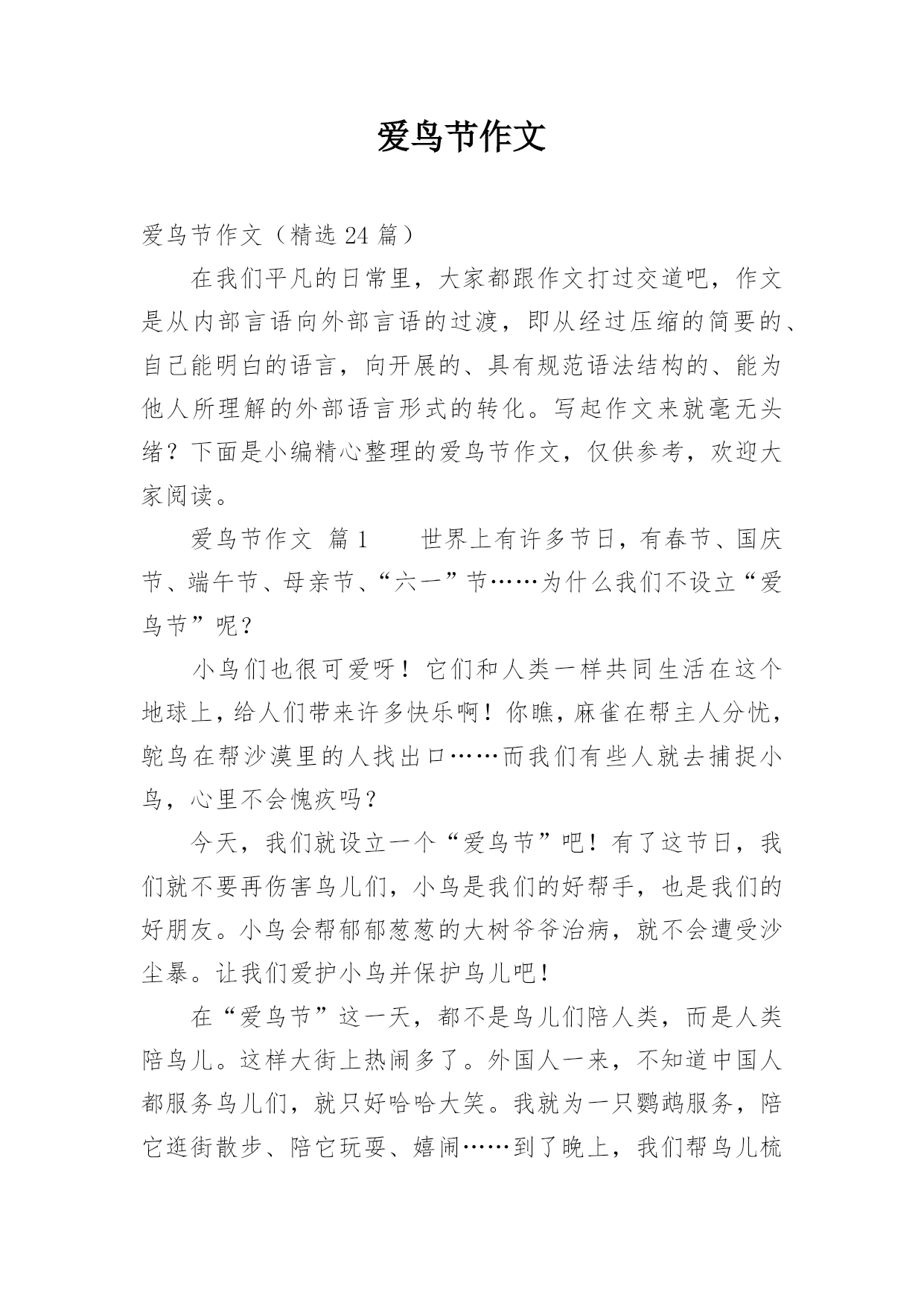 爱鸟节作文爱鸟节作文(精选24篇)在我们平凡的日常里,大家都跟作文打过交道吧,作文是从内部言语向外部言语的过渡,即从经过压缩的简要的、自己能明白的语言,向开展的、具有规范语法结构的、能为他人所理解的外部语言形式的转化。写起作文来就毫无头绪?下面是小编精心整理的爱鸟节作文,仅供参考,欢迎大家阅读。爱鸟节作文篇1世界上有许多节日,有春节、国庆节、端午节、母亲节、“六一”节……为什么我们不设立“爱鸟节”呢?小鸟们也很可爱呀!它们和人类一样共同生活在这个地球上,给人们带来许多快乐啊!你瞧,麻雀在帮主人分忧,鸵鸟在
