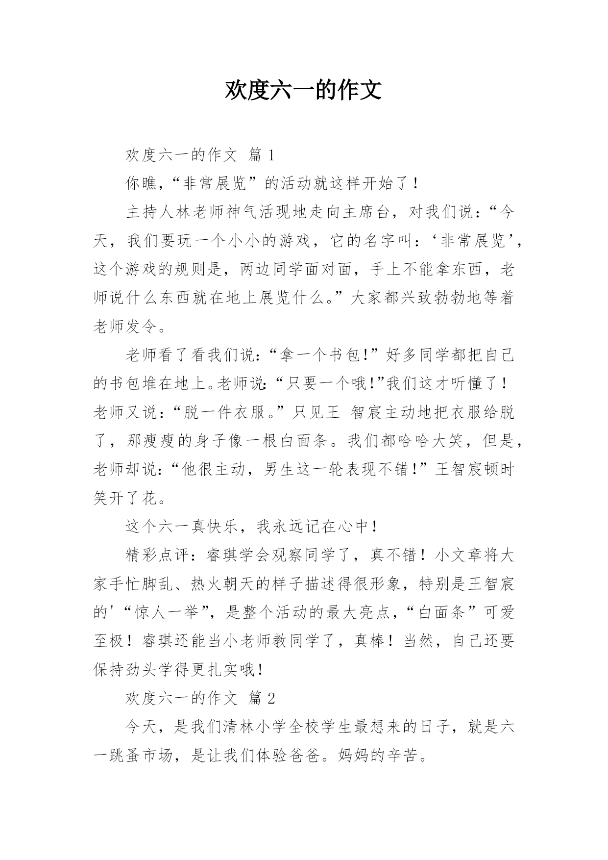 欢度六一的作文欢度六一的作文篇1你瞧,“非常展览”的活动就这样开始了!主持人林老师神气活现地走向主席台,对我们说:“今天,我们要玩一个小小的游戏,它的名字叫:‘非常展览’,这个游戏的规则是,两边同学面对面,手上不能拿东西,老师说什么东西就在地上展览什么。”大家都兴致勃勃地等着老师发令。老师看了看我们说:“拿一个书包!”好多同学都把自己的书包堆在地上。老师说:“只要一个哦!”我们这才听懂了!老师又说:“脱一件衣服。”只见王智宸主动地把衣服给脱了,那瘦瘦的身子像一根白面条。我们都哈哈大笑,但是,老师却说:“他