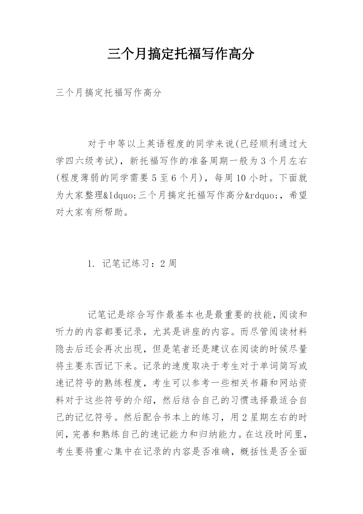 三个月搞定托福写作高分三个月搞定托福写作高分对于中等以上英语程度的同学来说(已经顺利通过大学四六级考试),新托福写作的准备周期一般为3个月左右(程度薄弱的同学需要5至6个月),每周10小时。下面就为大家整理“三个月搞定托福写作高分”,希望对大家有所帮助。1.记笔记练习:2周记笔记是综合写作最基本也是最重要的技能,阅读和听力的内容都要记录,尤其是讲座的内容。而尽管阅读材料隐去后还会再次出现,但是笔者还是建议在阅读的时候尽量将主要东西记下来。记录的速度取决于考生对于单词简写或速记符号的