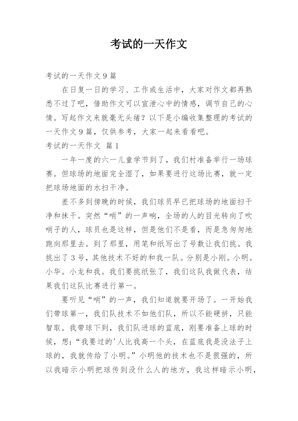 考试的一天作文考试的一天作文9篇在日复一日的学习、工作或生活中,大家对作文都再熟悉不过了吧,借助作文可以宣泄心中的情感,调节自己的心情。写起作文来就毫无头绪?以下是小编收集整理的考试的一天作文9篇,仅供参考,大家一起来看看吧。考试的一天作文篇1一年一度的六一儿童学节到了,我们村准备举行一场球赛。但球场的地面完全湿了,如果要进行这场比赛,就一定把球场地面的水扫干净。差不多到傍晚的时候,我们球员早已把球场的地面扫干净和抹干。突然“哨”的一声响,全场的人的目光转向了吹哨子的人,球员也是这样,但是他们不是看,而是