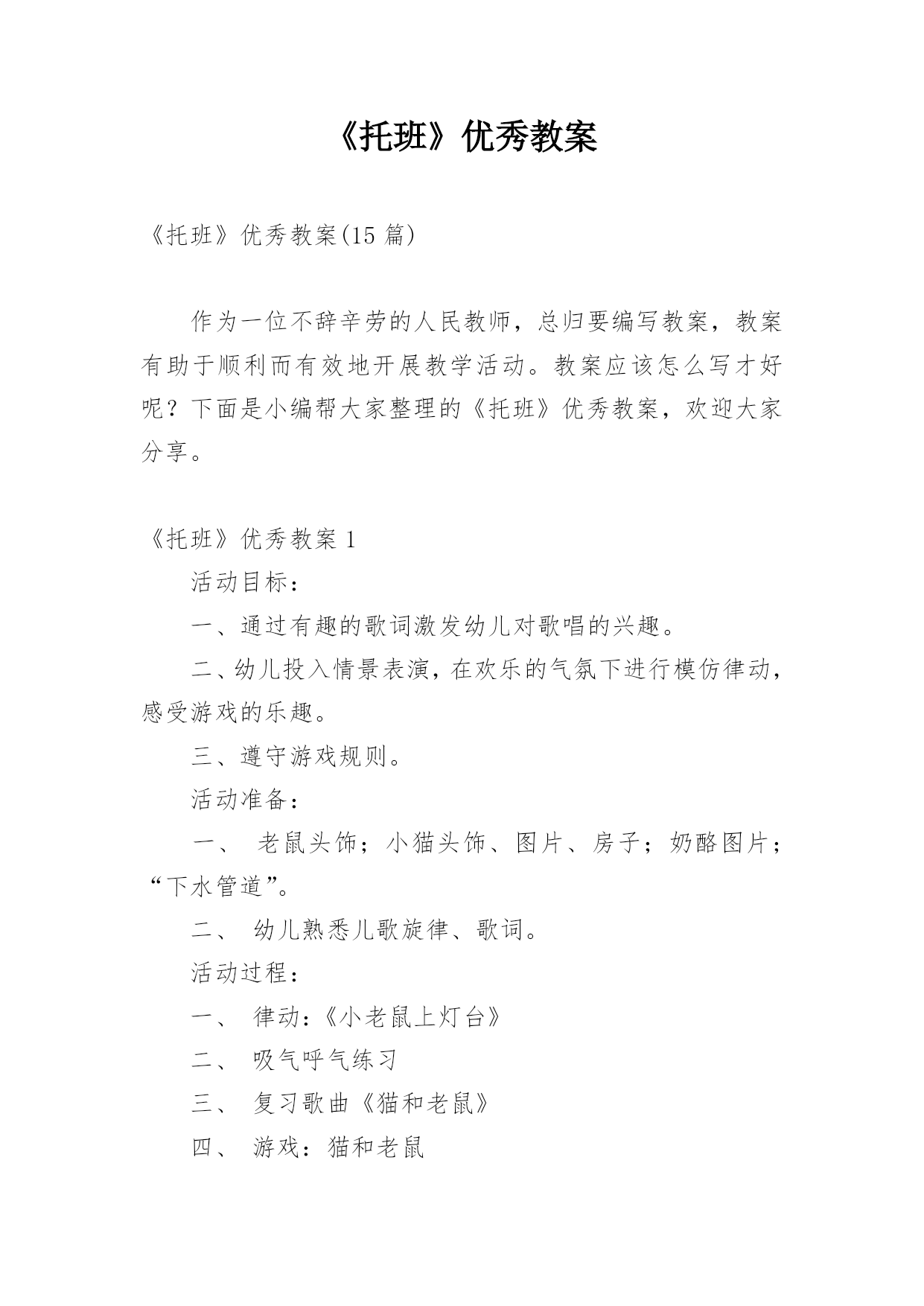 《托班》优秀教案《托班》优秀教案(15篇)作为一位不辞辛劳的人民教师,总归要编写教案,教案有助于顺利而有效地开展教学活动。教案应该怎么写才好呢?下面是小编帮大家整理的《托班》优秀教案,欢迎大家分享。《托班》优秀教案1活动目标:一、通过有趣的歌词激发幼儿对歌唱的兴趣。二、幼儿投入情景表演,在欢乐的气氛下进行模仿律动,感受游戏的乐趣。三、遵守游戏规则。活动准备:一、老鼠头饰;小猫头饰、图片、房子;奶酪图片;“下水管道”。二、幼儿熟悉儿歌旋律、歌词。活动过程:一、律动:《小老鼠上灯台》二、吸气呼气练习三、复习歌