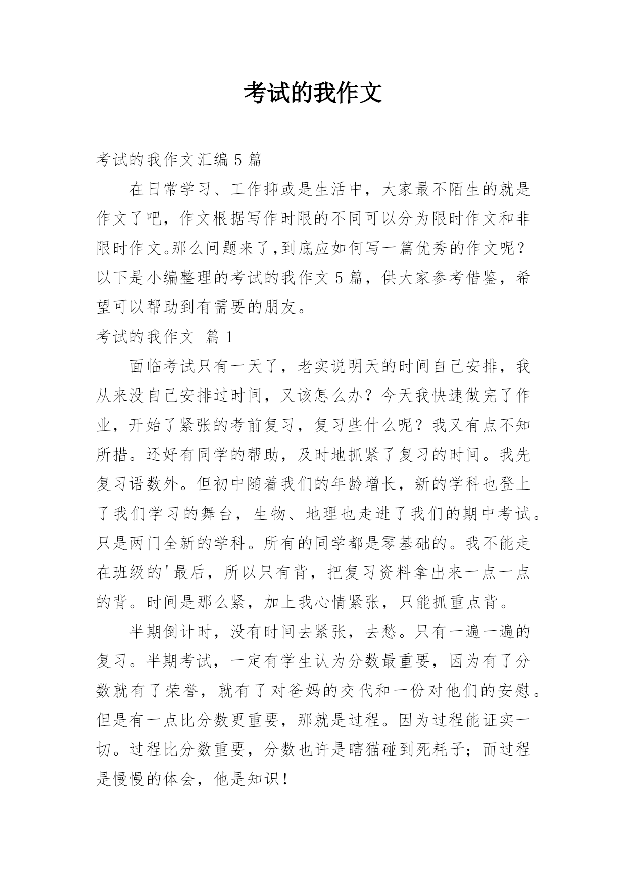 考试的我作文考试的我作文汇编5篇在日常学习、工作抑或是生活中,大家最不陌生的就是作文了吧,作文根据写作时限的不同可以分为限时作文和非限时作文。那么问题来了,到底应如何写一篇优秀的作文呢?以下是小编整理的考试的我作文5篇,供大家参考借鉴,希望可以帮助到有需要的朋友。考试的我作文篇1面临考试只有一天了,老实说明天的时间自己安排,我从来没自己安排过时间,又该怎么办?今天我快速做完了作业,开始了紧张的考前复习,复习些什么呢?我又有点不知所措。还好有同学的帮助,及时地抓紧了复习的时间。我先复习语数外。但初中随着我们