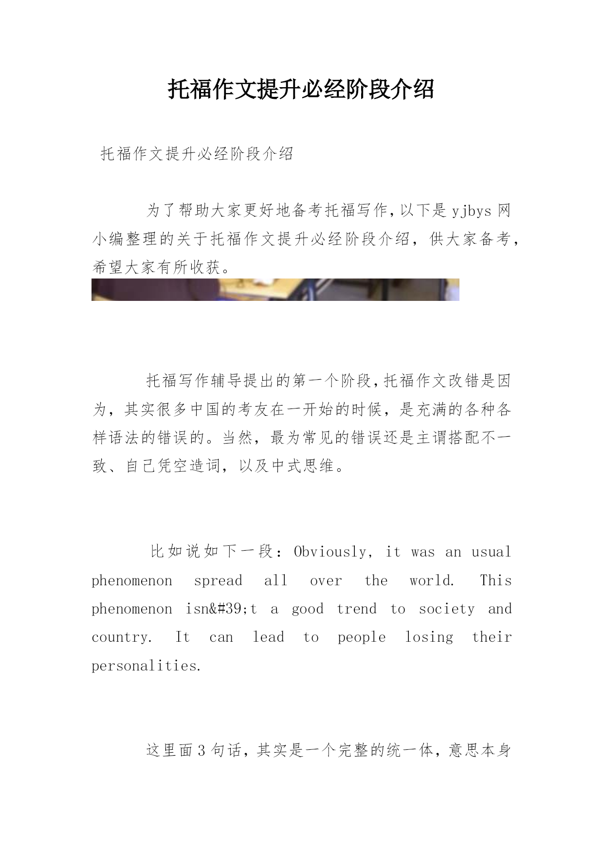 托福作文提升必经阶段介绍托福作文提升必经阶段介绍为了帮助大家更好地备考托福写作,以下是yjbys网小编整理的关于托福作文提升必经阶段介绍,供大家备考,希望大家有所收获。托福写作辅导提出的第一个阶段,托福作文改错是因为,其实很多中国的考友在一开始的时候,是充满的各种各样语法的错误的。当然,最为常见的错误还是主谓搭配不一致、自己凭空造词,以及中式思维。比如说如下一段:Obviously,itwasanusualphenomenonspreadallovertheworld.Thisphenomenonisn&