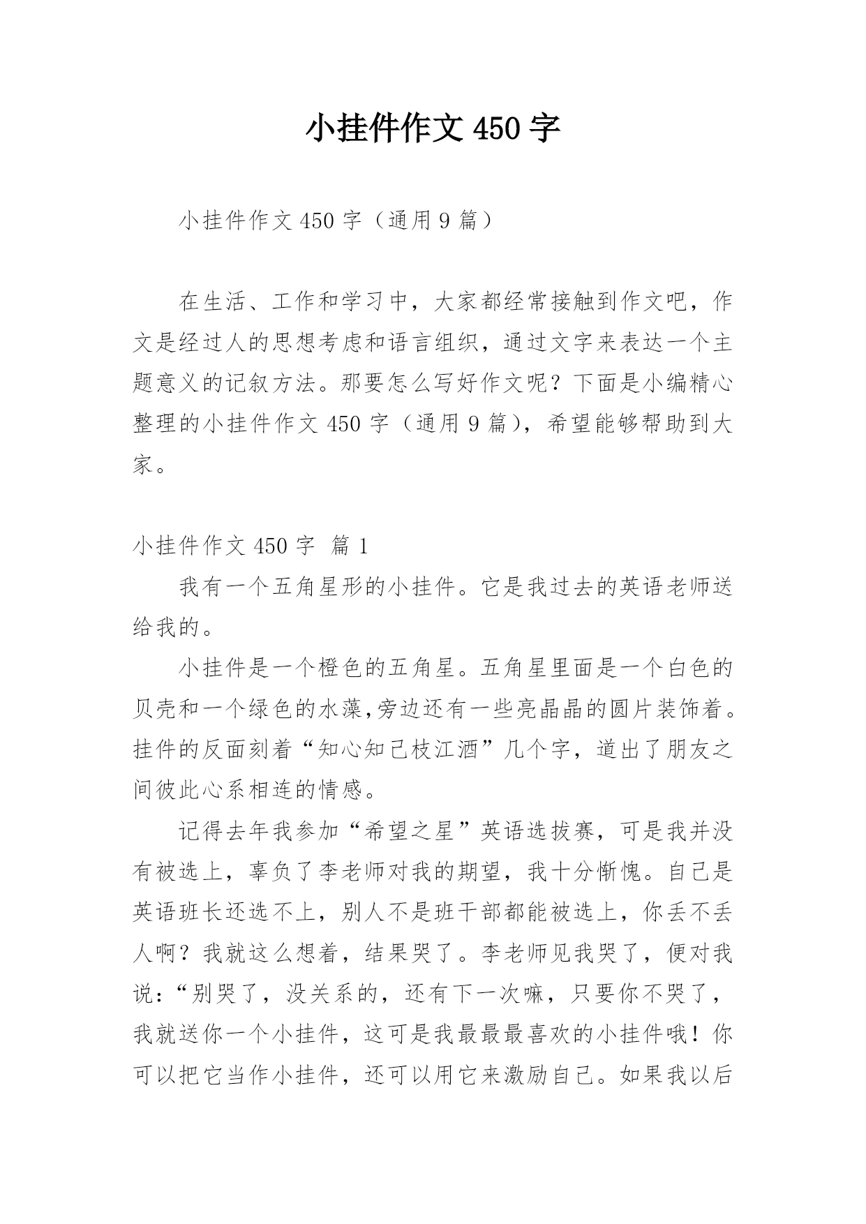 小挂件作文450字小挂件作文450字(通用9篇)在生活、工作和学习中,大家都经常接触到作文吧,作文是经过人的思想考虑和语言组织,通过文字来表达一个主题意义的记叙方法。那要怎么写好作文呢?下面是小编精心整理的小挂件作文450字(通用9篇),希望能够帮助到大家。小挂件作文450字篇1我有一个五角星形的小挂件。它是我过去的英语老师送给我的。小挂件是一个橙色的五角星。五角星里面是一个白色的贝壳和一个绿色的水藻,旁边还有一些亮晶晶的圆片装饰着。挂件的反面刻着“知心知己枝江酒”几个字,道出了朋友之间彼此心系相连的情感
