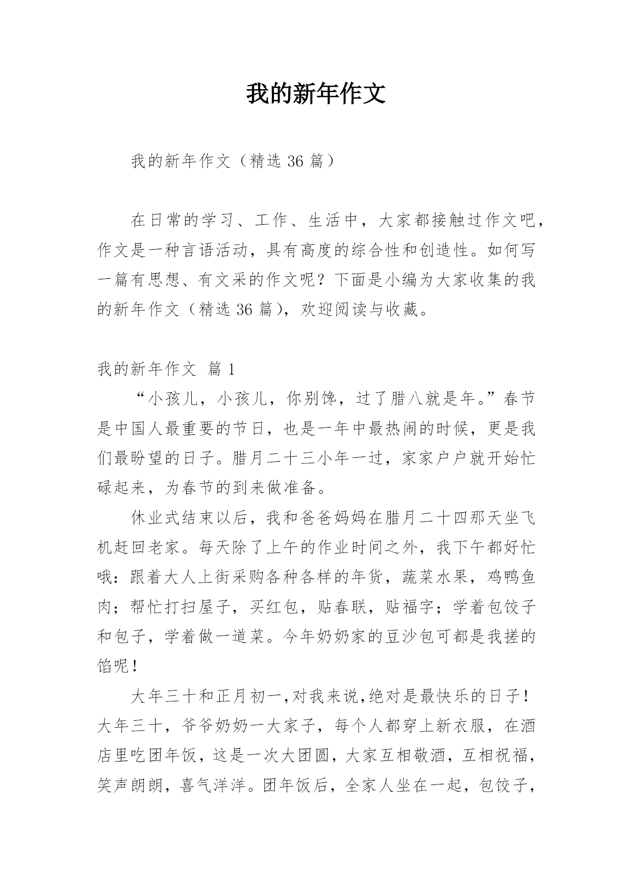 我的新年作文我的新年作文(精选36篇)在日常的学习、工作、生活中,大家都接触过作文吧,作文是一种言语活动,具有高度的综合性和创造性。如何写一篇有思想、有文采的作文呢?下面是小编为大家收集的我的新年作文(精选36篇),欢迎阅读与收藏。我的新年作文篇1“小孩儿,小孩儿,你别馋,过了腊八就是年。”春节是中国人最重要的节日,也是一年中最热闹的时候,更是我们最盼望的日子。腊月二十三小年一过,家家户户就开始忙碌起来,为春节的到来做准备。休业式结束以后,我和爸爸妈妈在腊月二十四那天坐飞机赶回老家。每天除了上午的作业时间