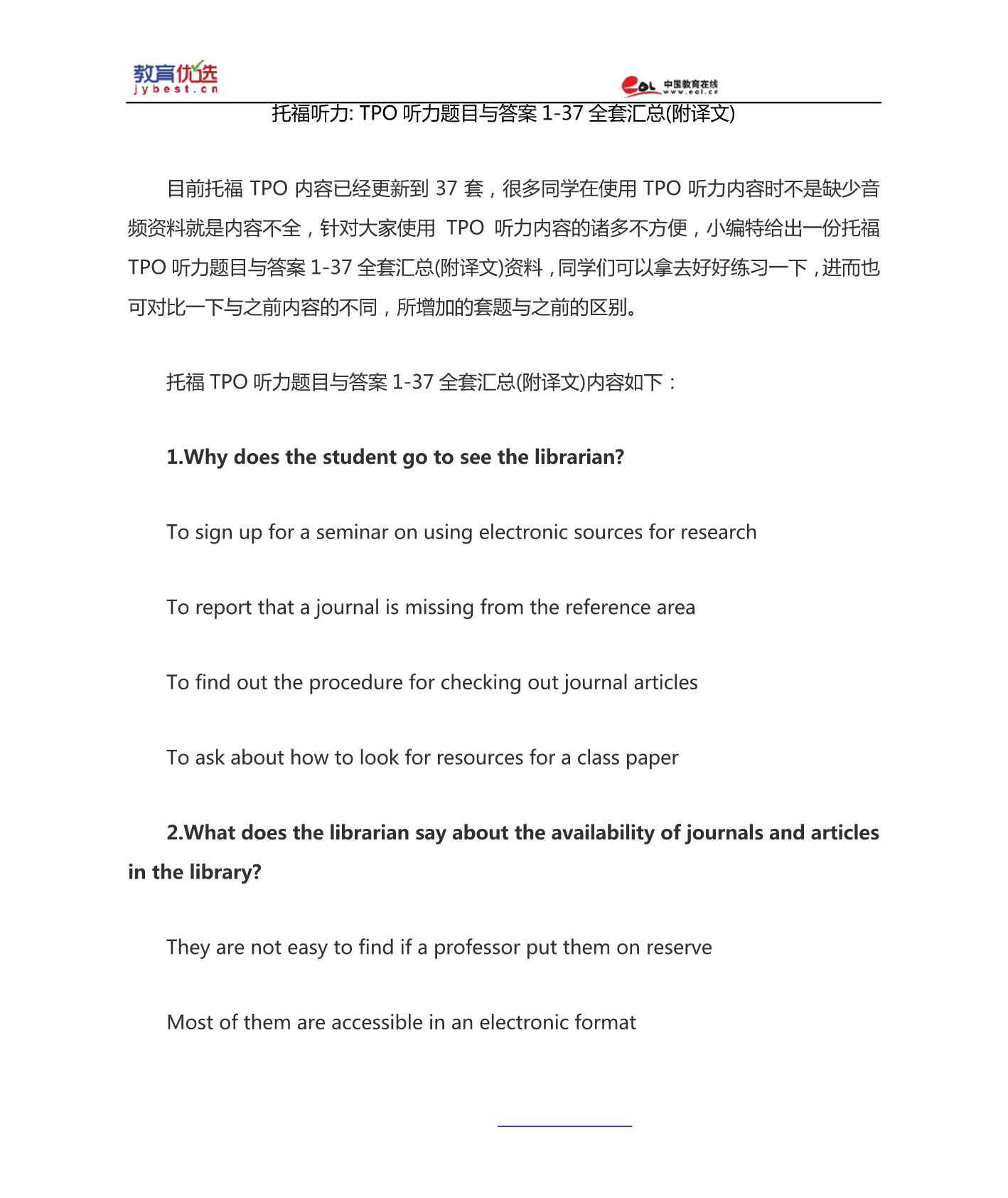 托福听力:TPO听力题目与答案1-37全套汇总(附译文)目前托福TPO内容已经更新到37套,很多同学在使用TPO听力内容时不是缺少音频资料就是内容不全,针对大家使用TPO听力内容的诸多不方便,小编特给出一份托福TPO听力题目与答案1-37全套汇总(附译文)资料,同学们可以拿去好好练习一下,进而也可对比一下与之前内容的不同,所增加的套题与之前的区别。托福TPO听力题目与答案1-37全套汇总(附译文)内容如下:1.Whydoesthestudentgotoseethelibrarian?Tosignupfor