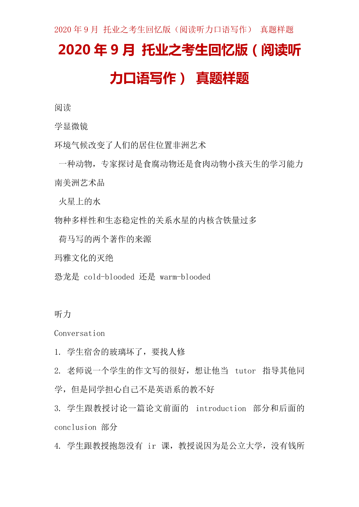 2020年9月托业之考生回忆版(阅读听力口语写作)真题样题2020年9月托业之考生回忆版(阅读听力口语写作)真题样题阅读学显微镜环境气候改变了人们的居住位置非洲艺术一种动物,专家探讨是食腐动物还是食肉动物小孩天生的学习能力南美洲艺术品火星上的水物种多样性和生态稳定性的关系水星的内核含铁量过多荷马写的两个著作的来源玛雅文化的灭绝恐龙是cold-blooded还是warm-blooded听力Conversation1.学生宿舍的玻璃坏了,要找人修2.老师说一个学生的作文写的很好,想让他当tutor指导其他同学