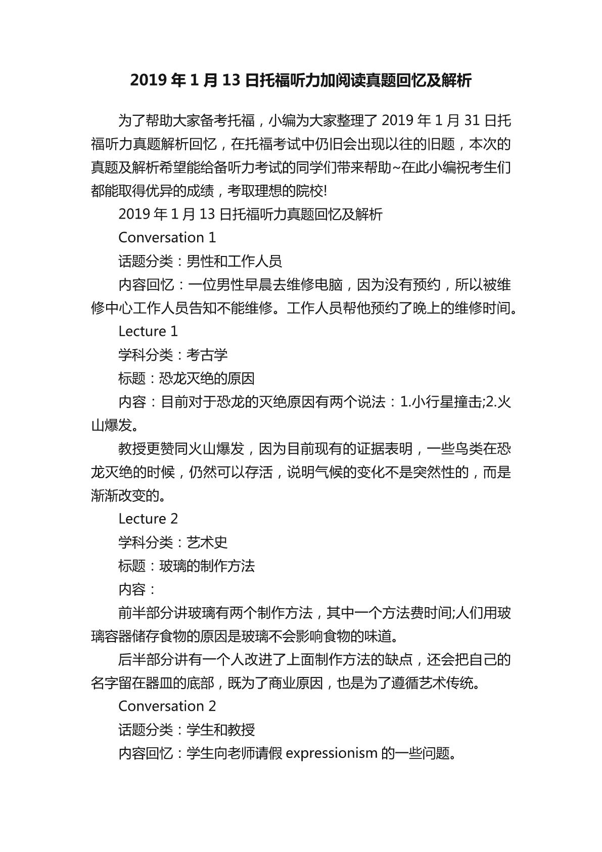 2019年1月13日托福听力加阅读真题回忆及解析为了帮助大家备考托福,小编为大家整理了2019年1月31日托福听力真题解析回忆,在托福考试中仍旧会出现以往的旧题,本次的真题及解析希望能给备听力考试的同学们带来帮助~在此小编祝考生们都能取得优异的成绩,考取理想的院校!2019年1月13日托福听力真题回忆及解析Conversation1话题分类:男性和工作人员内容回忆:一位男性早晨去维修电脑,因为没有预约,所以被维修中心工作人员告知不能维修。工作人员帮他预约了晚上的维修时间。Lecture1学科分类:考古学标