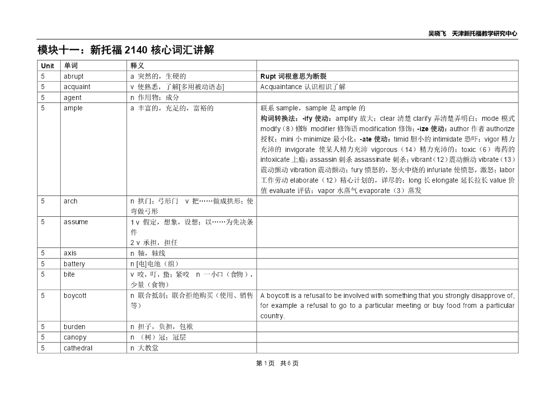 吴晓飞天津新托福教学研究中心模块十一:新托福2140核心词汇讲解Unit单词释义5abrupta突然的,生硬的Rupt词根意思为断裂5acquaintv使熟悉,了解[多用被动语态]Acquaintance认识相识了解5agentn作用物;成分5amplea丰富的,充足的,富裕的联系sample,sample是ample的构词转换法:-ify使动:amplify放大;clear清楚clarify弄清楚弄明白;mode模式modify(8)修饰modifier修饰语modification修饰;-ize使动: