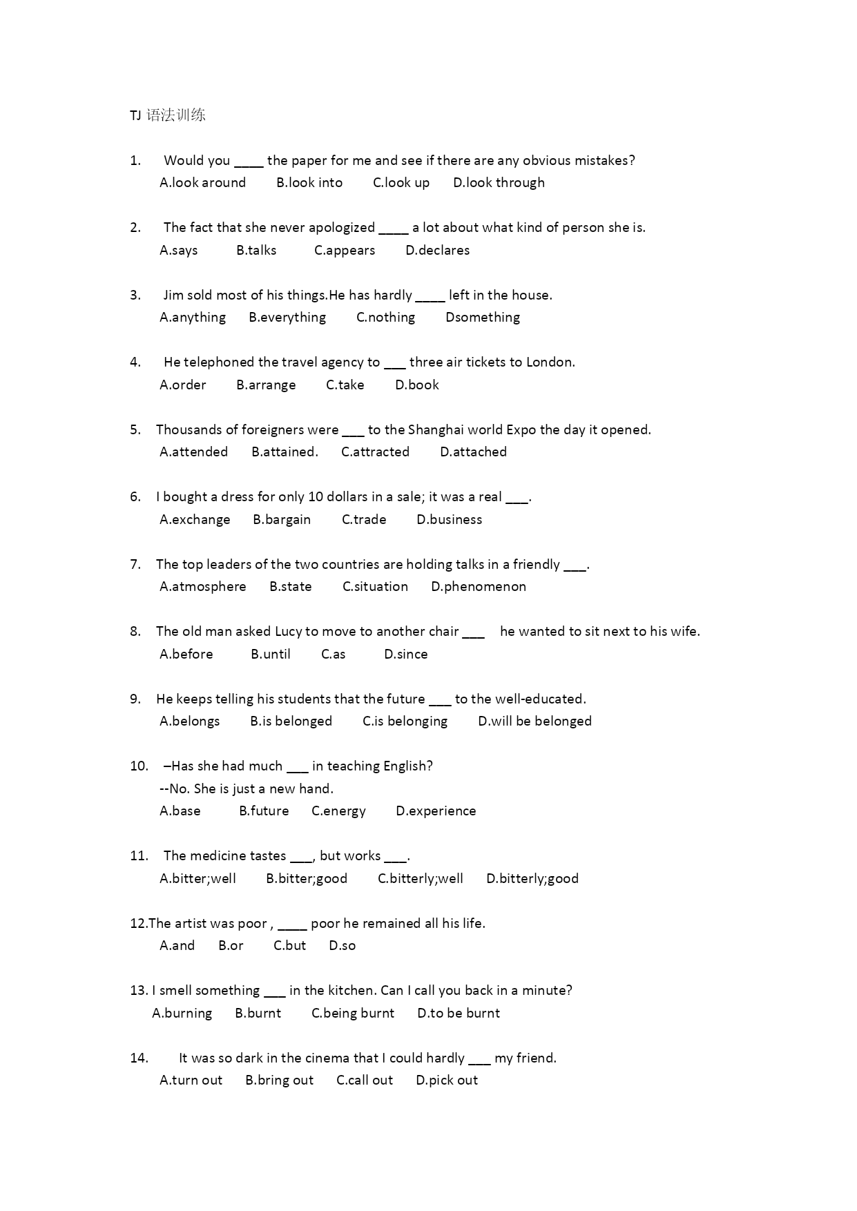 TJ语法训练1.Wouldyou____thepaperformeandseeifthereareanyobviousmistakes?A.lookaroundB.lookintoC.lookupD.lookthrough2.Thefactthatsheneverapologized____alotaboutwhatkindofpersonsheis.A.saysB.talksC.appearsD.declares3.Jimsoldmostofhisthings.Hehashardly____leftin