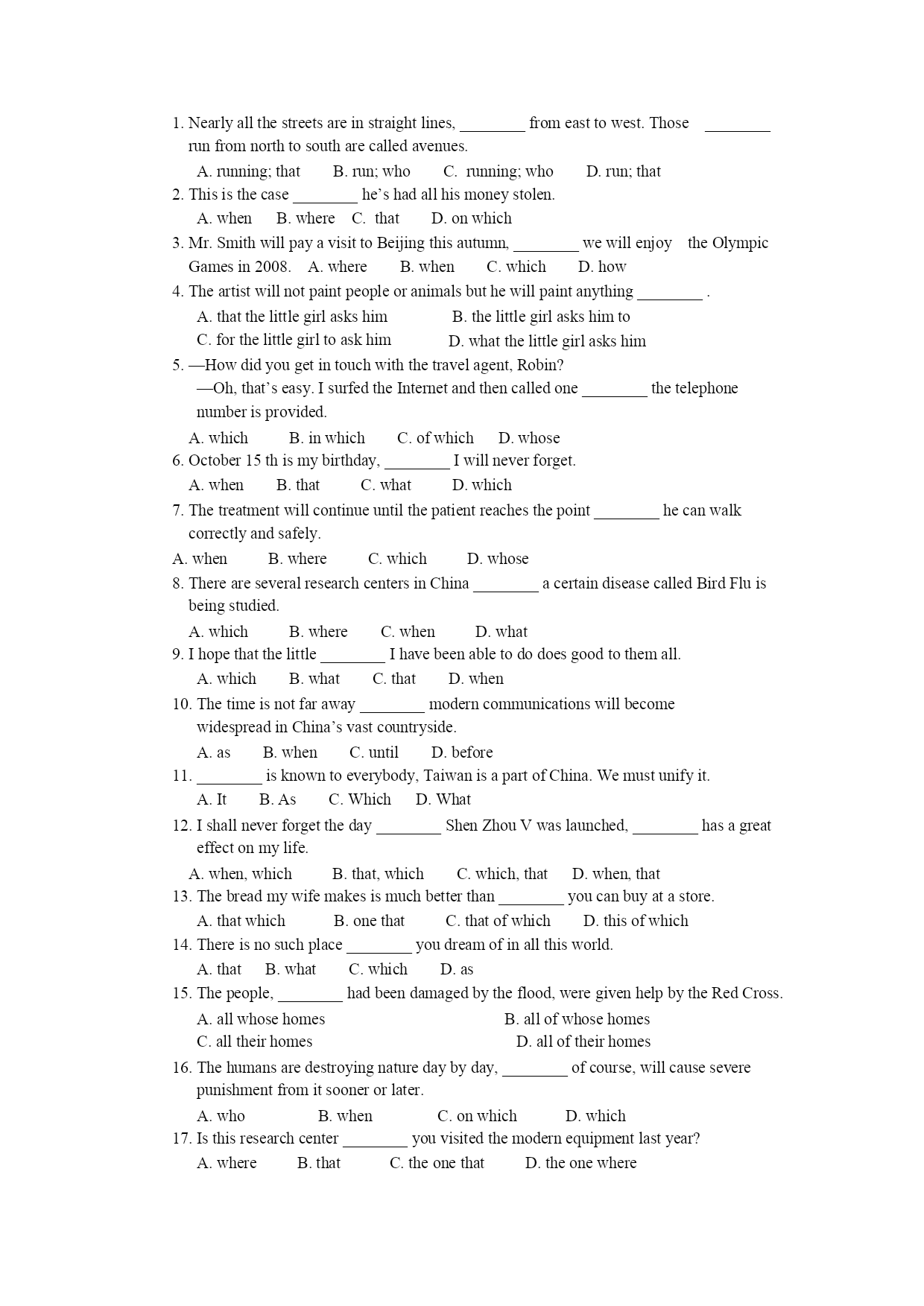 1.Nearlyallthestreetsareinstraightlines,________fromeasttowest.Thoserunfromnorthtosoutharecalledavenues.________A.running;that2.Thisisthecase________he’shadallhismoneystolen.A.whenB.whereC.thatD.onwhich3.Mr.SmithwillpayavisittoBeijingthisautumn,________we