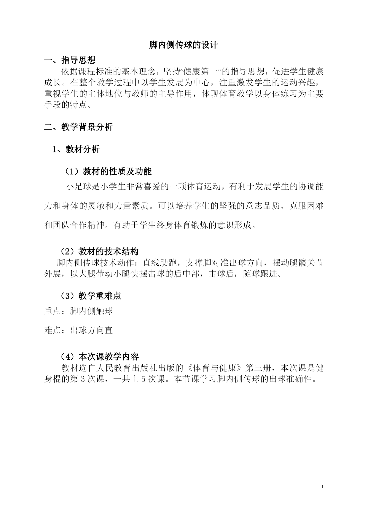 脚内侧传球的设计一、指导思想依据课程标准的基本理念,坚持“健康第一”的指导思想,促进学生健康成长。在整个教学过程中以学生发展为中心,注重激发学生的运动兴趣,重视学生的主体地位与教师的主导作用,体现体育教学以身体练习为主要手段的特点。二、教学背景分析1、教材分析(1)教材的性质及功能小足球是小学生非常喜爱的一项体育运动,有利于发展学生的协调能力和身体的灵敏和力量素质。可以培养学生的坚强的意志品质、克服困难和团队合作精神。有助于学生终身体育锻炼的意识形成。(2)教材的技术结构脚内侧传球技术动作:直线助跑,支撑