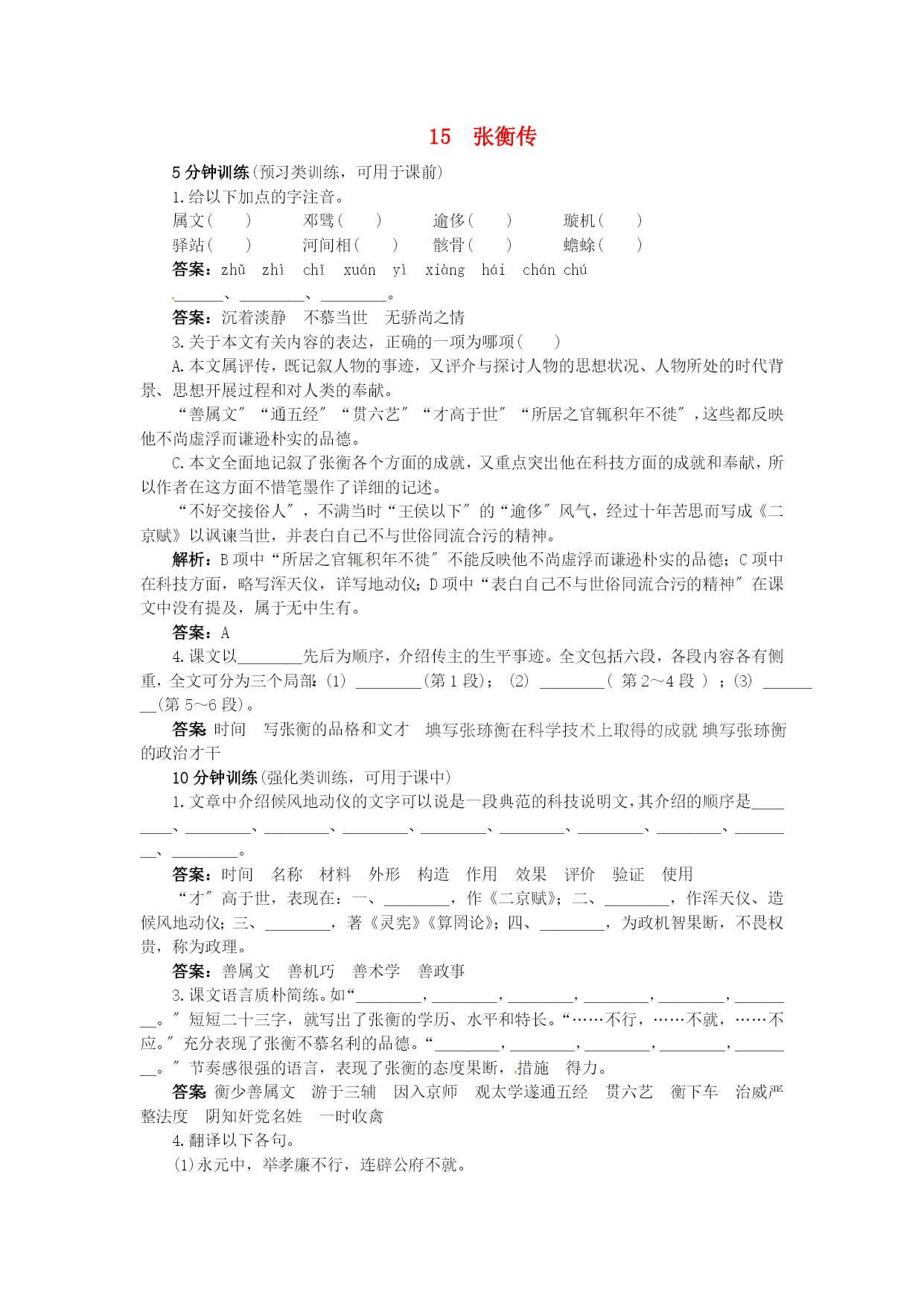 15张衡传5分钟训练(预习类训练,可用于课前)1.给以下加点的字注音。属文()邓骘()逾侈()璇机()驿站()河间相()骸骨()蟾蜍()答案:zhǔzhìchǐxuányìxiàngháichánchú___、____、____。答案:沉着淡静不慕当世无骄尚之情3.关于本文有关内容的表达,正确的一项为哪项()A.本文属评传,既记叙人物的事迹,又评介与探讨人物的思想状况、人物所处的时代背景、思想开展过程和对人类的奉献。“善属文〞“通五经〞“贯六艺〞“才高于世〞“所居之官辄积年不徙〞,这些都反映他不尚虚浮而谦