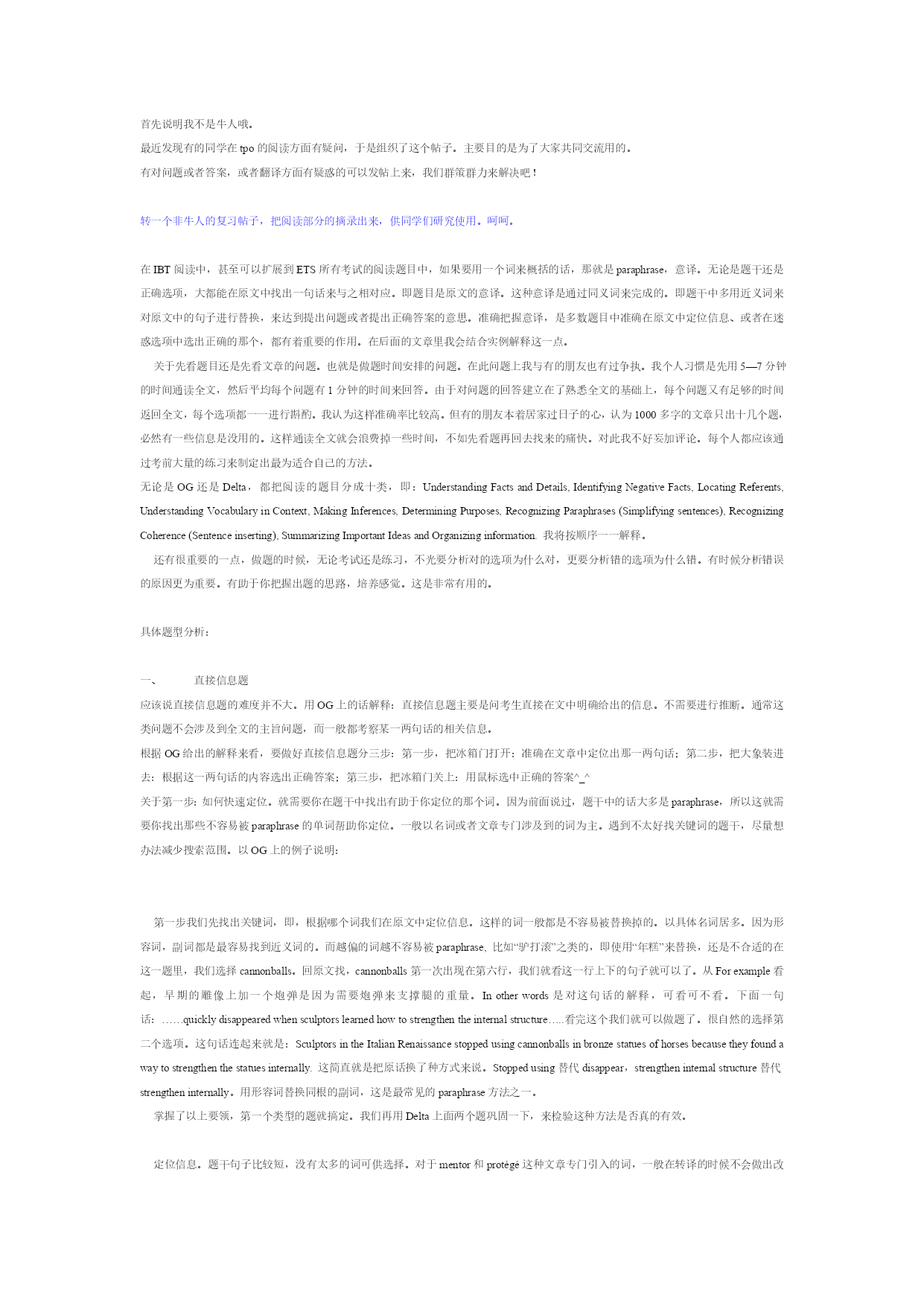 首先说明我不是牛人哦。'O8e"j5E;r&v6l'j3f最近发现有的同学在tpo的阅读方面有疑问,于是组织了这个帖子。主要目的是为了大家共同交流用的。2|3L7g6D)X8c,}有对问题或者答案,或者翻译方面有疑惑的可以发帖上来,我们群策群力来解决吧!9{(N$B0\-GE)v,i/w"B"m&q1V)p_转一个非牛人的复习帖子,把阅读部分的摘录出来,供同学们研究使用。呵呵。(C)s6T'B5^+t.C.v,k9D8J"j2G在IBT阅读中,甚至可以扩展到ETS所有考试的阅读题目中,如果要用一个词来概括