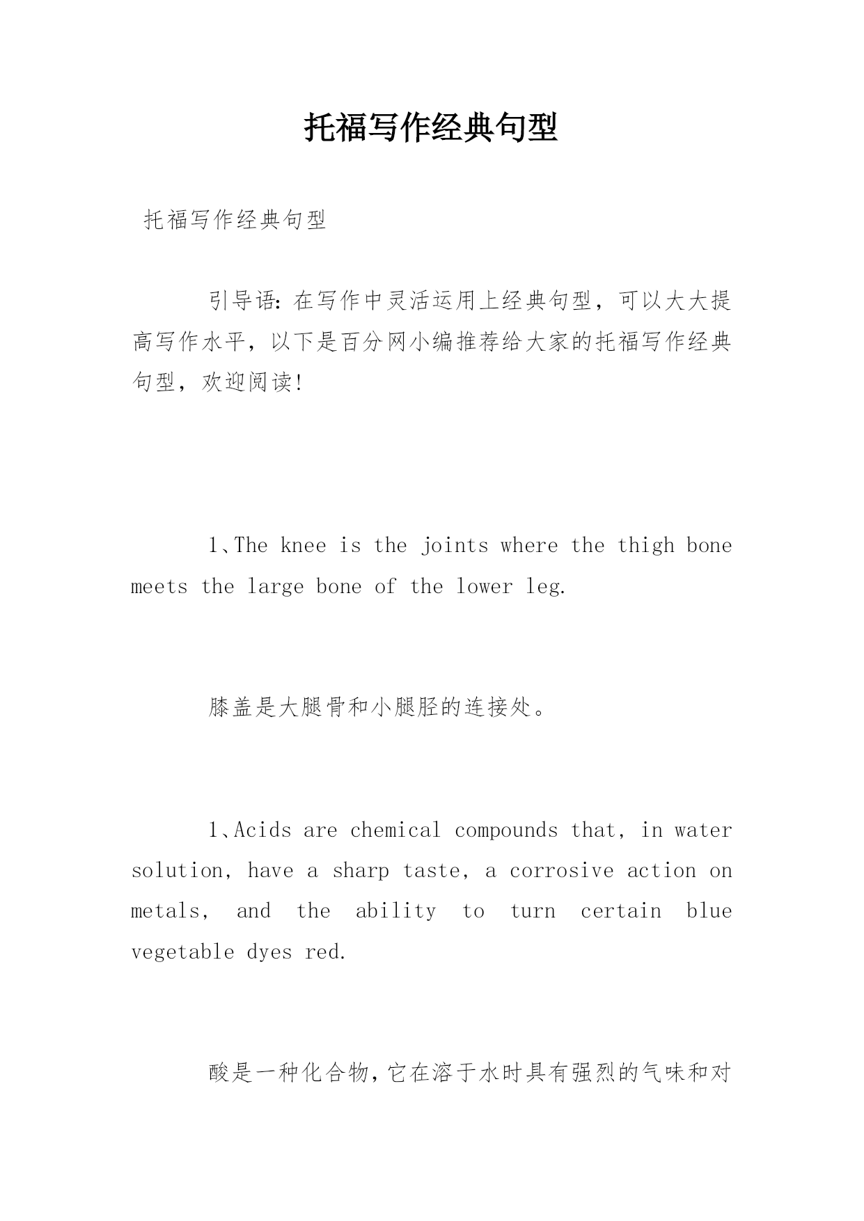 托福写作经典句型托福写作经典句型引导语:在写作中灵活运用上经典句型,可以大大提高写作水平,以下是百分网小编推荐给大家的托福写作经典句型,欢迎阅读!1、Thekneeisthejointswherethethighbonemeetsthelargeboneofthelowerleg.膝盖是大腿骨和小腿胫的连接处。1、Acidsarechemicalcompoundsthat,inwatersolution,haveasharptaste,acorrosiveactiononmetals,andtheabil