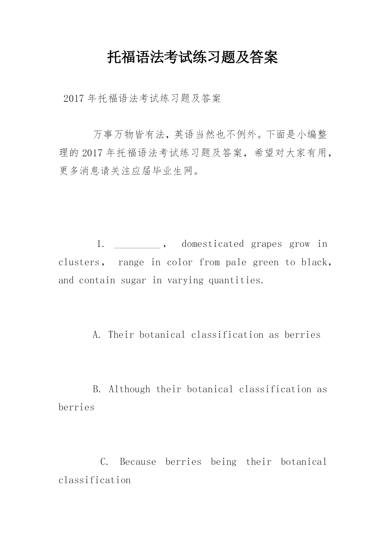 托福语法考试练习题及答案2017年托福语法考试练习题及答案万事万物皆有法,英语当然也不例外。下面是小编整理的2017年托福语法考试练习题及答案,希望对大家有用,更多消息请关注应届毕业生网。1._________,domesticatedgrapesgrowinclusters,rangeincolorfrompalegreentoblack,andcontainsugarinvaryingquantities.A.TheirbotanicalclassificationasberriesB.Althoug