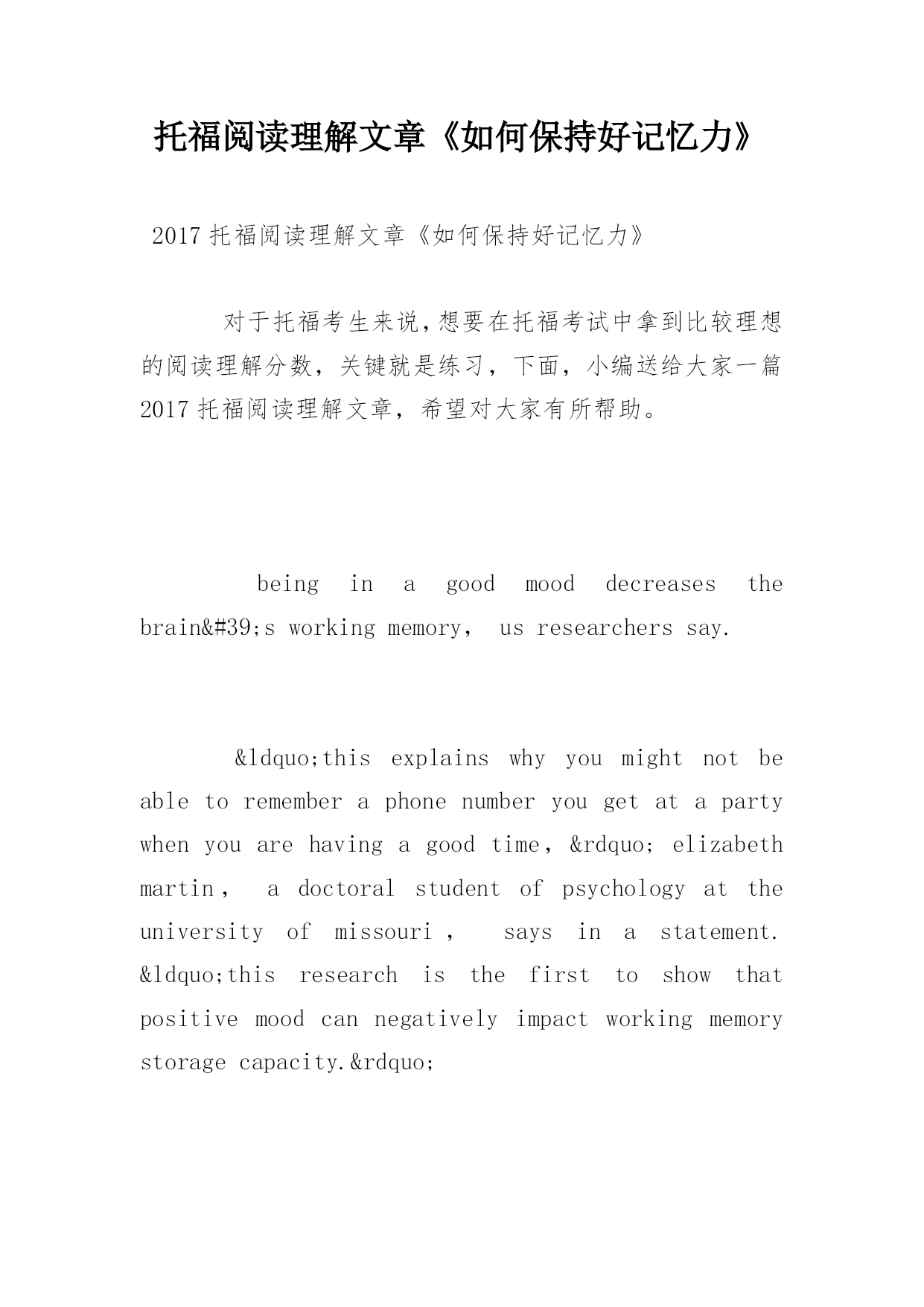 托福阅读理解文章《如何保持好记忆力》2017托福阅读理解文章《如何保持好记忆力》对于托福考生来说,想要在托福考试中拿到比较理想的阅读理解分数,关键就是练习,下面,小编送给大家一篇2017托福阅读理解文章,希望对大家有所帮助。beinginagoodmooddecreasesthebrain'sworkingmemory,usresearcherssay.“thisexplainswhyyoumightnotbeabletorememberaphonenumberyougetatapar