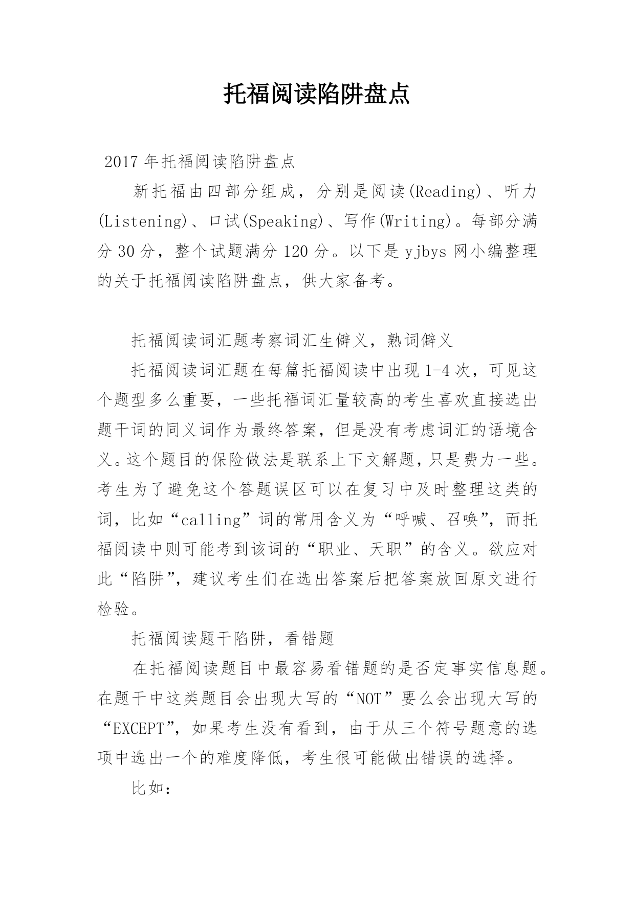 托福阅读陷阱盘点2017年托福阅读陷阱盘点新托福由四部分组成,分别是阅读(Reading)、听力(Listening)、口试(Speaking)、写作(Writing)。每部分满分30分,整个试题满分120分。以下是yjbys网小编整理的关于托福阅读陷阱盘点,供大家备考。托福阅读词汇题考察词汇生僻义,熟词僻义托福阅读词汇题在每篇托福阅读中出现1-4次,可见这个题型多么重要,一些托福词汇量较高的考生喜欢直接选出题干词的同义词作为最终答案,但是没有考虑词汇的语境含义。这个题目的保险做法是联系上下文解题,只是费