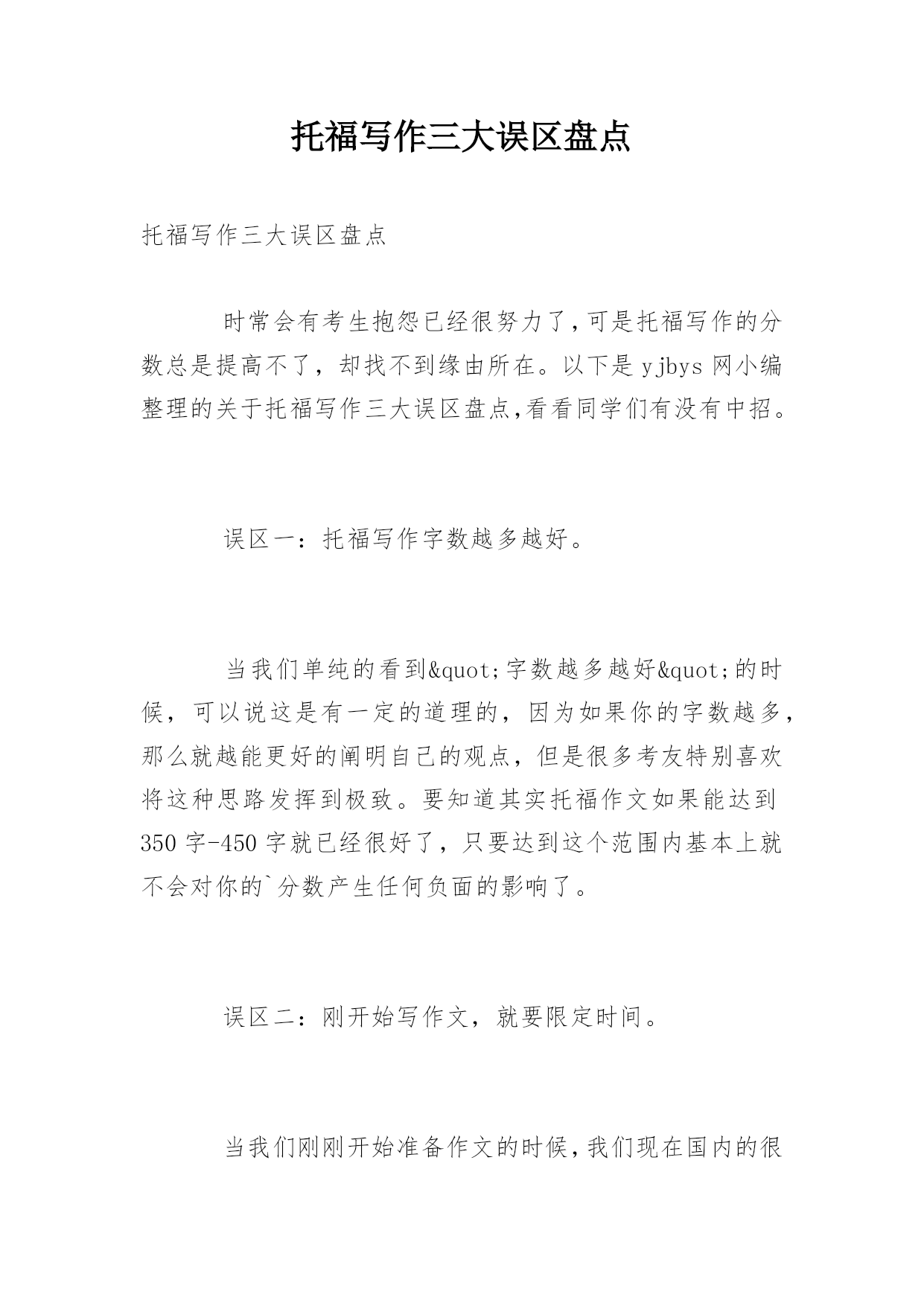 托福写作三大误区盘点托福写作三大误区盘点时常会有考生抱怨已经很努力了,可是托福写作的分数总是提高不了,却找不到缘由所在。以下是yjbys网小编整理的关于托福写作三大误区盘点,看看同学们有没有中招。误区一:托福写作字数越多越好。当我们单纯的看到"字数越多越好"的时候,可以说这是有一定的道理的,因为如果你的字数越多,那么就越能更好的阐明自己的观点,但是很多考友特别喜欢将这种思路发挥到极致。要知道其实托福作文如果能达到350字-450字就已经很好了,只要达到这个范围内基本上就不会对你的`分数